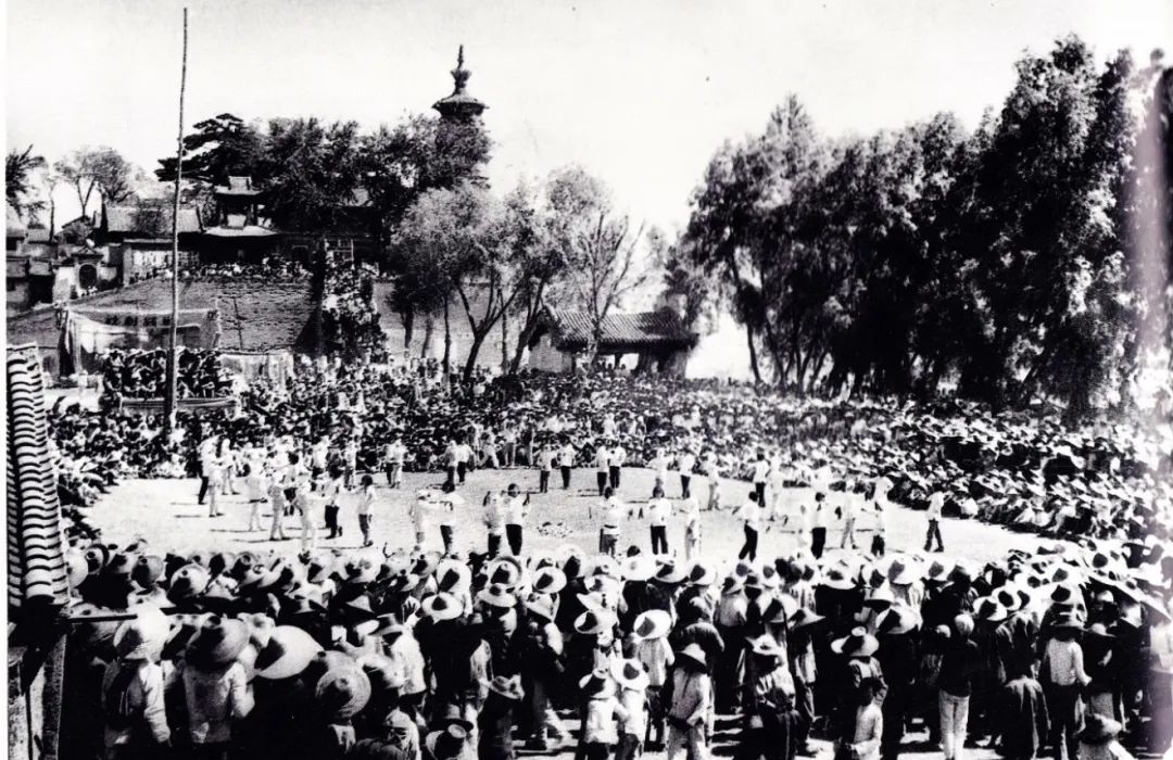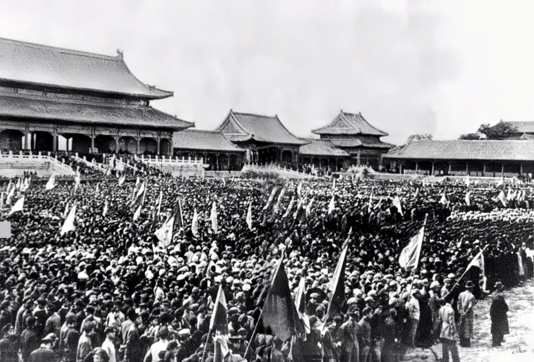 北平民众在故宫太和殿前欢庆胜利