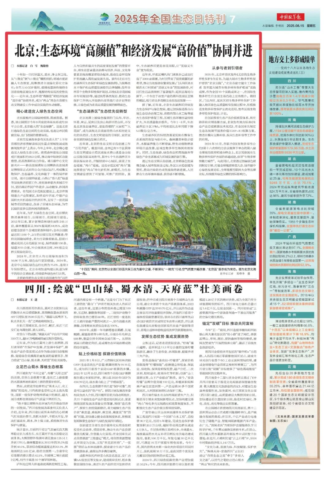 十年如一日打好蓝天、碧水、净土保卫战,从“1微克”到“0.1微克”精抓细扣;将城市更新融入生态修复,统筹推进全域绿化彩化立体化;全市万元GDP能耗、碳排放量始终保持全国省级地区最优水平,能源结构实现历史性优化……近年来,生态环境“高颜值”和经济发展“高价值”协同并进,成为“两山”理念在首都生态文明建设工作中成功实践的生动缩影。