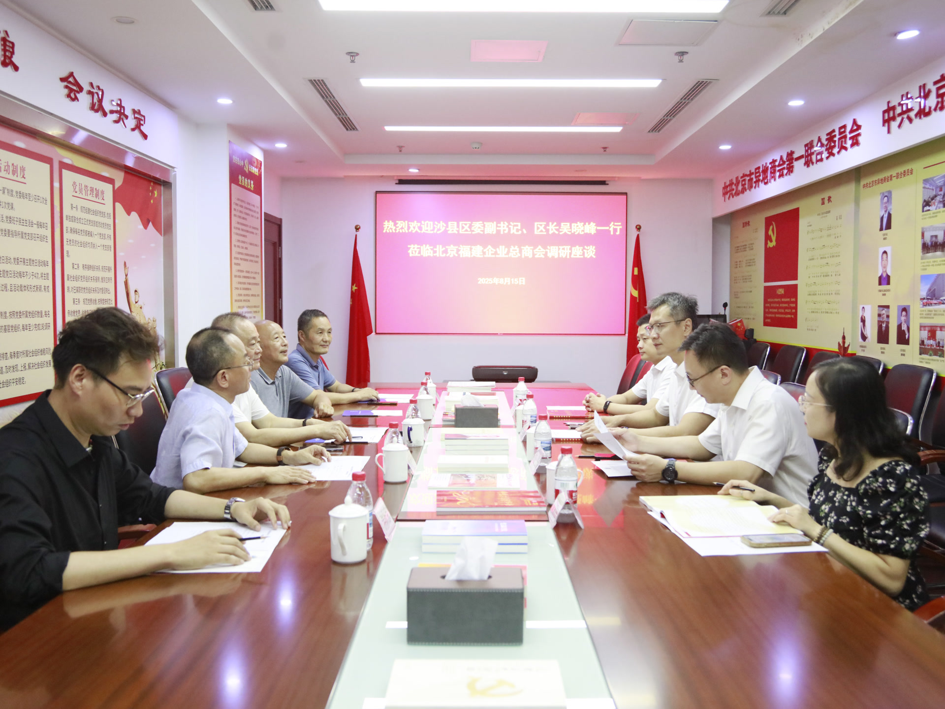 8月15日下午,三明市沙县区委副书记、区长吴晓峰,三明市政府驻京联络处主任黄兰春,沙县区委常委、宣传部部长周颖,区委常委、副区长龙腾,区商务局局长严蔚、区工商联党组书记姜丽伟等领导莅临总商会调研座谈。