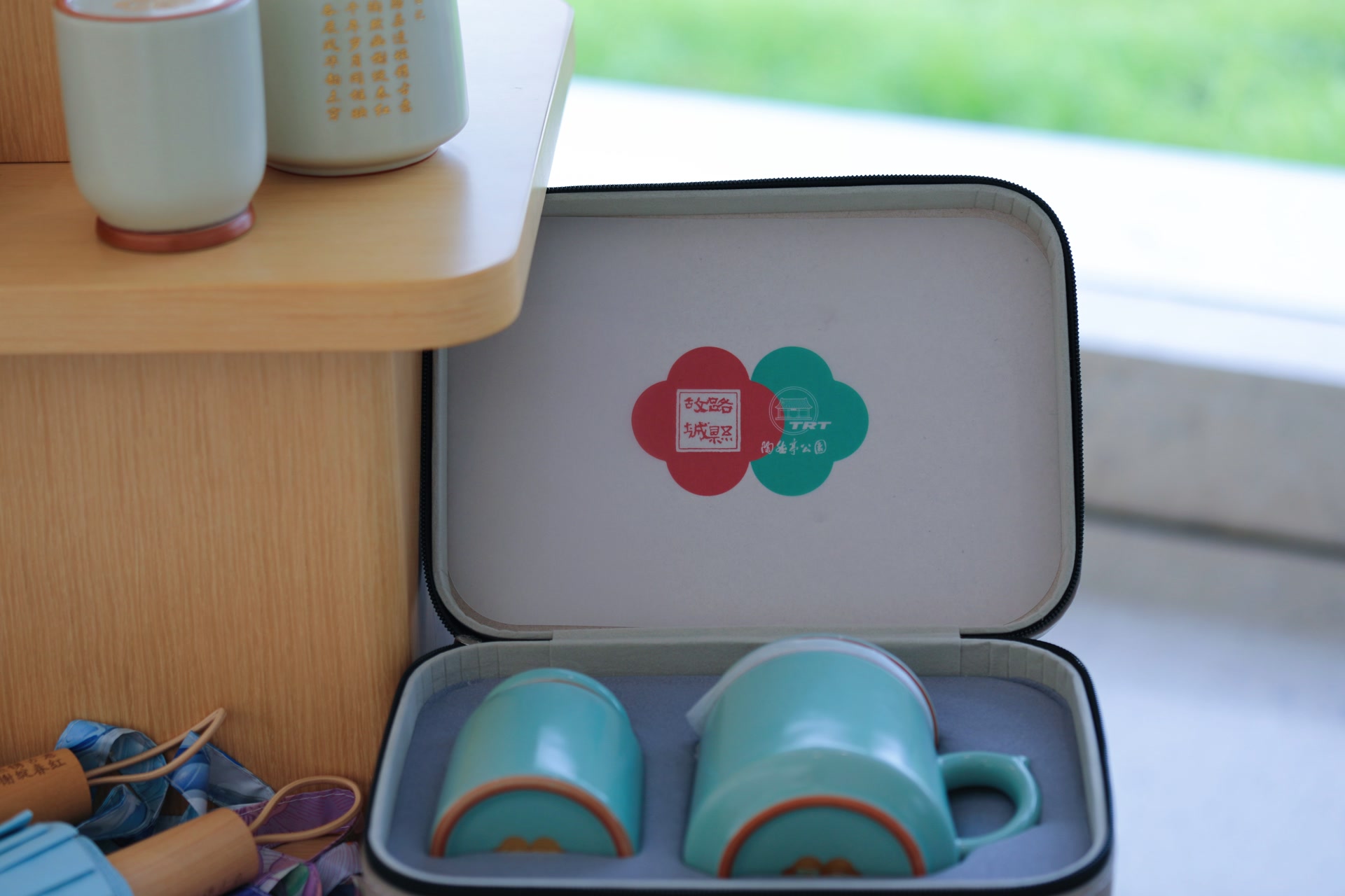 更让人惊喜的是双园联名文创——折扇融合诗词与《江亭修禊图》,茶具刻有双园LOGO与经典诗句,传统灵感借现代设计焕发光彩,许多游客将这份“可带走的文化”收入囊中,让古韵延续到日常生活里。