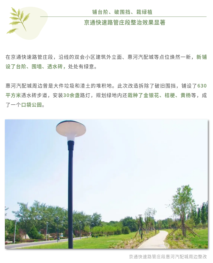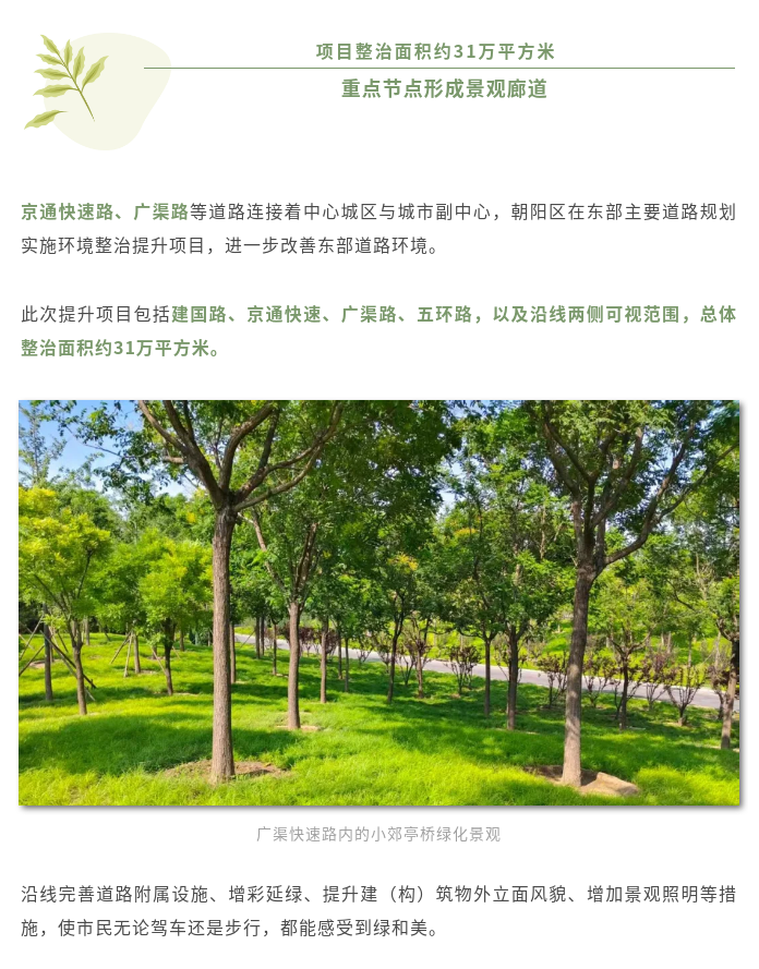 好消息!京通快速路、广渠路等朝阳区东部主要道路环境整治提升项目近日完工啦!如今,道路沿线变身集生态保护、休闲游憩、景观展示于一体的风景廊道。🌳🌼🌲🌸“绿”为底色,“治”为基础,打造的风景线究竟有多美?一起来看看~
