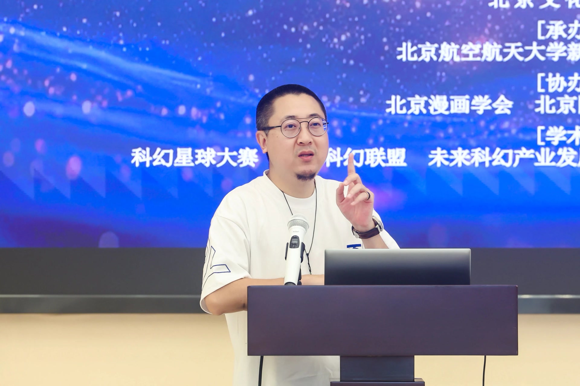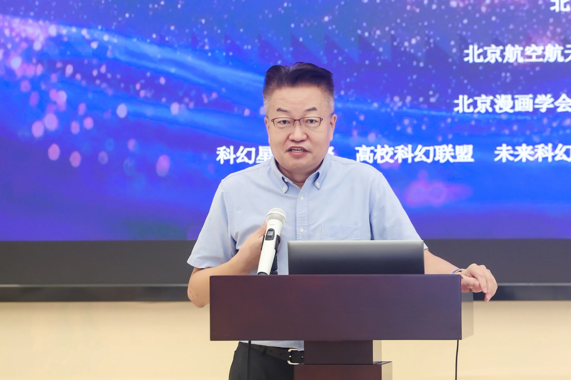 北航新媒体艺术与设计学院沈旭昆院长作开场致辞。他表示科幻美术是连接艺术想象力与科技创造力的重要纽带,北航作为兼具科技与艺术资源的高校,始终致力于推动跨学科融合,为培养复合型科幻创作人才搭建平台。最近热映的国产二维动画榜首电影《浪浪山的小妖怪》正是於水导演(北航新媒体艺术与设计学院副教授)在跨学科平台开展的实践教学成果。