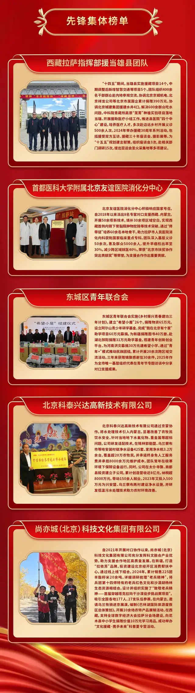 西藏拉萨指挥部援当雄县团队、首都医科大学附属北京友谊医院消化分中心等5个集体,充分发挥团队力量,以强大凝聚力和战斗力,为受援地区发展注入强劲动能,荣获2025年“北京榜样・支援合作先锋”第一期先锋集体称号。