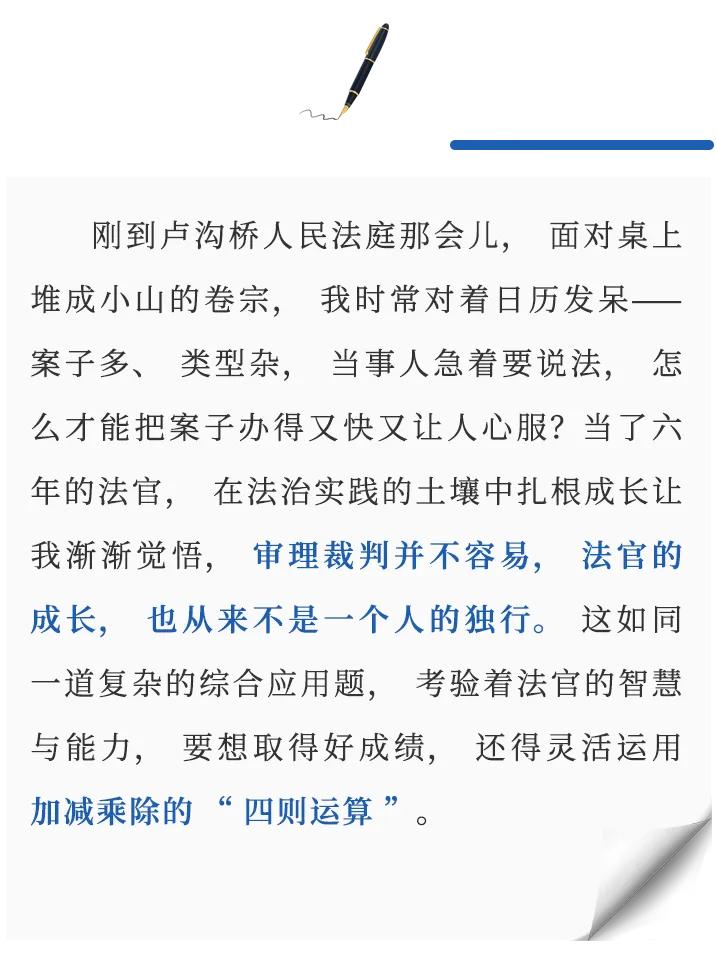 如今再看桌上的卷宗,不再是压力,反倒像一本本“成长日记”。这“四则运算”算的是案件效率,更是民心向背——加的是团队合力,减的是群众诉累,乘的是司法公信,除的是矛盾隔阂。往后的路,我和团队还会接着算下去,算好每一笔“公正账”,让每个当事人都能感受到:法律有力度,更有温度。