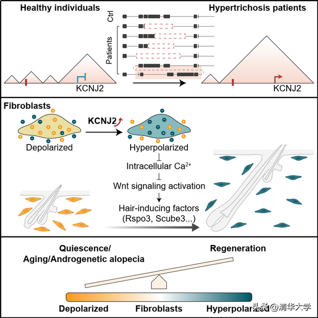 8月15日,清华大学生物医学交叉研究院陈婷团队在《细胞》(Cell)在线发表题为“成纤维细胞生物电信号驱动毛发生长”(Fibroblast bioelectric signaling drives hair growth)的研究论文。研究首次发现,皮肤成纤维细胞的膜电位状态是毛发再生的关键调控因素:超极化促进毛发生长,而去极化则抑制毛发生长。在CGHT患者中,染色体构象变化导致KCNJ2基因在成纤维细胞中特异性上调。机制上,KCNJ2的上调引起膜电位超极化,从而通过降低细胞内钙浓度增强Wnt信号响应,最终促进毛发再生。此外,KCNJ2介导的超极化在雄秃及老年小鼠模型中同样可以促进毛发生长,显示出良好的临床应用潜力。