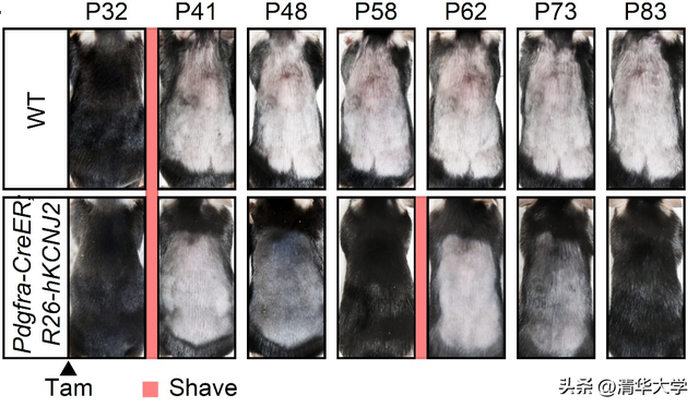 图2.野生型小鼠(WT)与成纤维细胞特异性过表达KCNJ2小鼠(Pdgfra-CreER;R26-hKCNJ2)的毛发再生情况对比