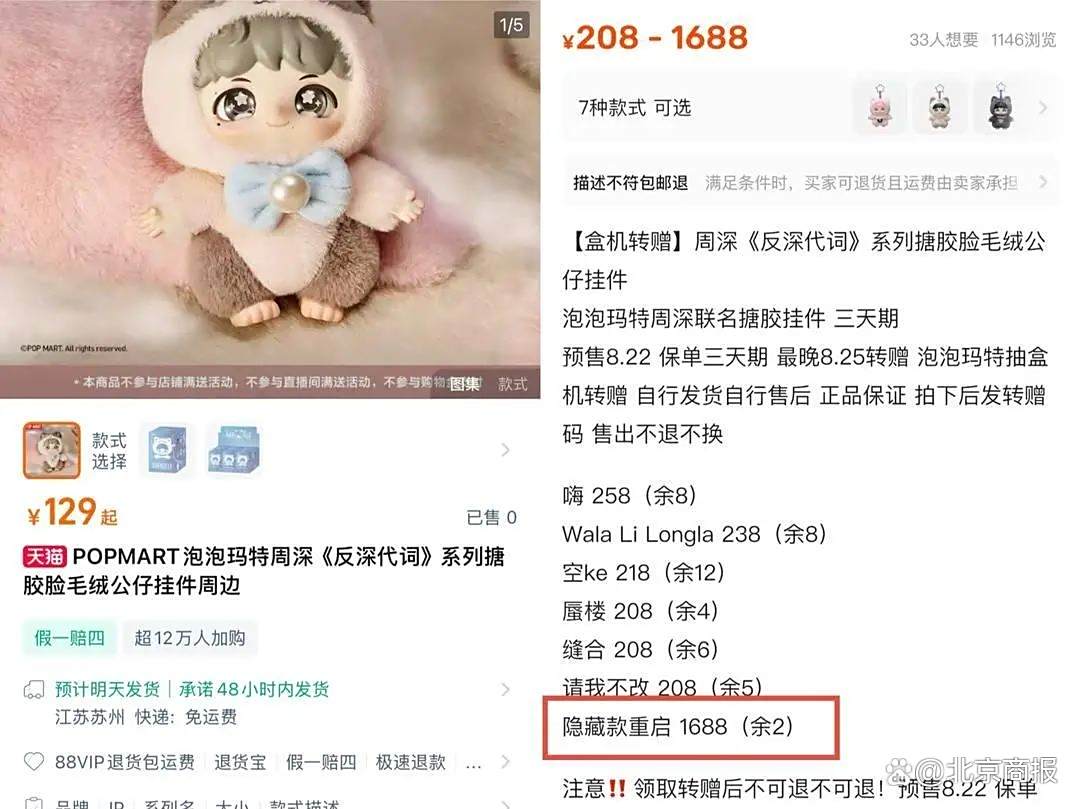 封面新闻记者看到,其中一款搪胶盲盒是与歌手周深的联名款,原价129元一个,目前有超过12万人加购,然而二手平台上,其普通款式标价200元左右,隐藏款甚至被炒到了1688元。