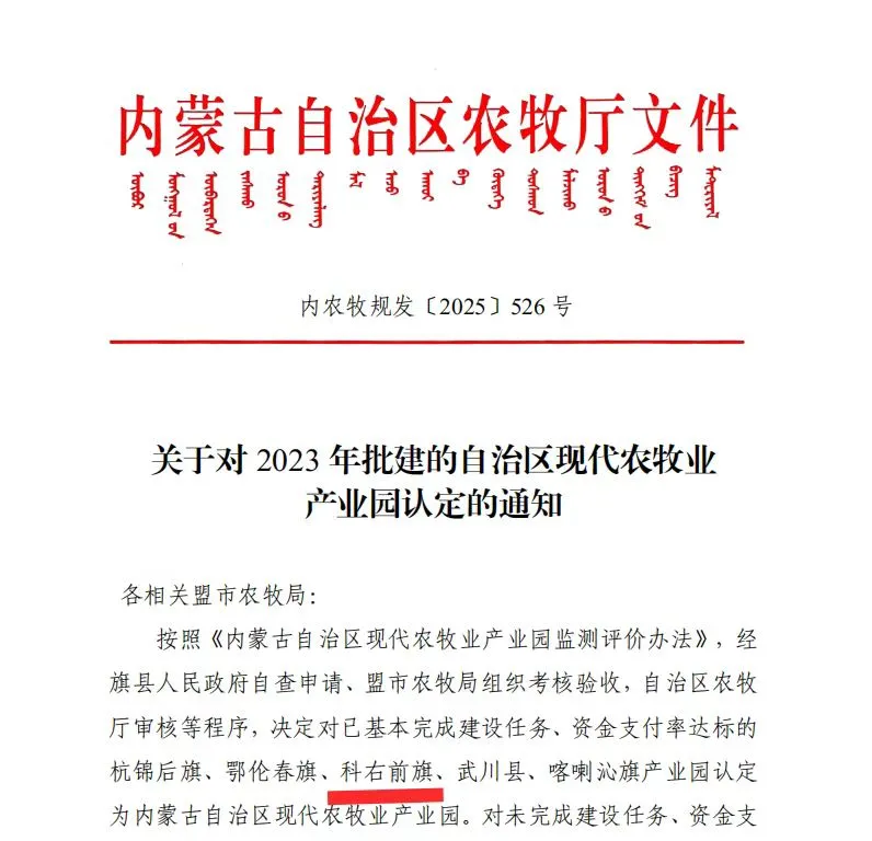 根据内蒙古自治区农牧厅《关于对2023年批建的自治区现代农牧业产业园认定的通知》文件,经旗县人民政府自查申请、盟市农牧局组织考核验收,自治区农牧厅审核等一系列程序,科右前旗凭借突出的资源优势和扎实的前期准备,通过2年的创建,认定为内蒙古自治区现代农牧业产业园。