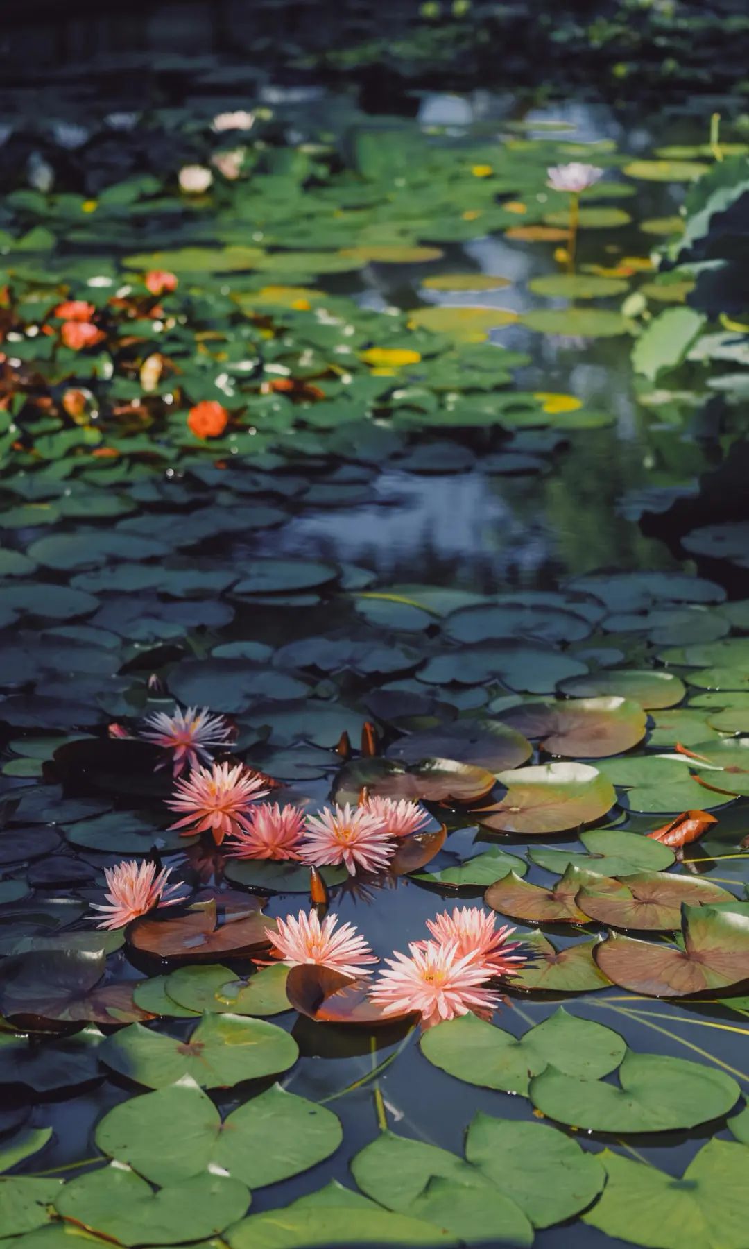 身旁睡莲如同调色盘上晕染开的缤纷色彩