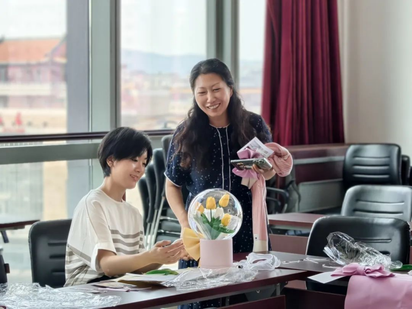 为让健康理念更易融入生活,活动设置了郁金香主题永生花“抱抱桶”(一种圆形花艺容器)制作环节。花艺老师讲解了永生花的工艺与保养技巧,并阐释其象征生命恒久的美好寓意。“永生花的持久,正如中医倡导的健康长寿”,老师的一句话,让现场参与者会心一笑。在老师的指导下,大家精心挑选花材、设计造型,将中医的“调和”之美融入到指尖创作中。活动现场气氛热烈,参与者们互相交流心得,共同完成作品,欢声笑语不断。