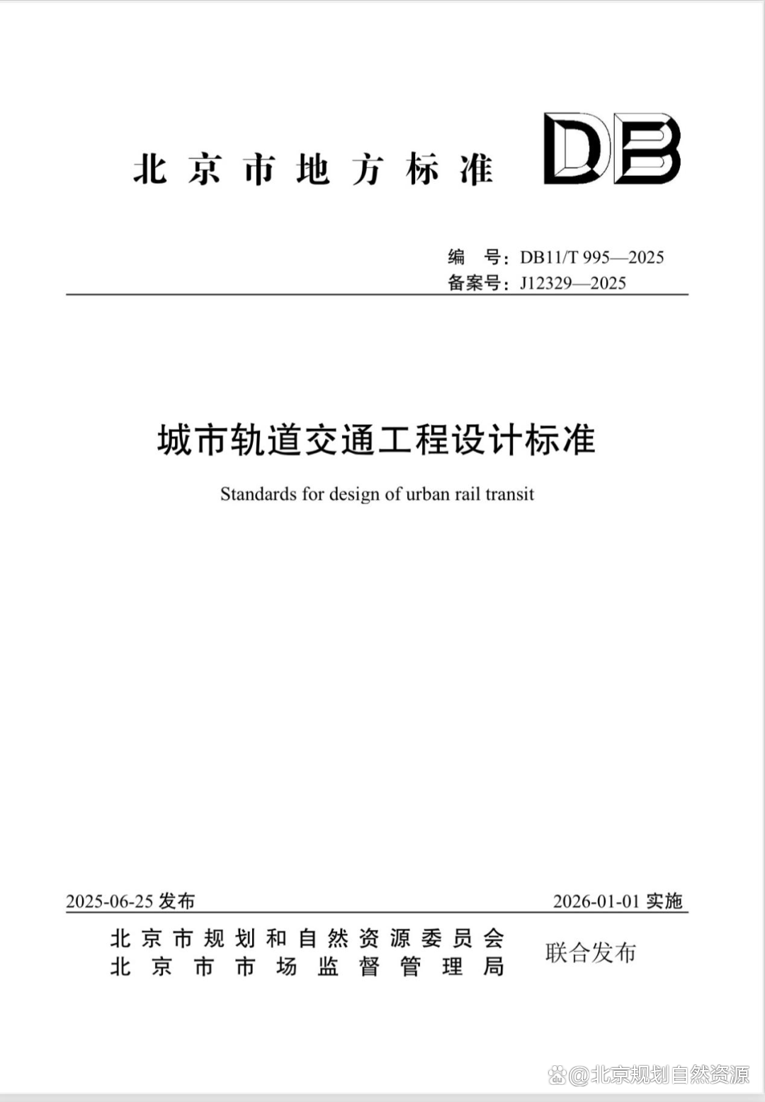 为贯彻落实习近平总书记“北京要继续大力发展轨道交通,构建综合、绿色、安全、智能的立体化现代化城市交通系统,始终保持国际最先进水平,打造现代化国际大都市”指示精神、市委市政府对促进北京市轨道交通高质量发展的要求,北京市规划和自然资源委员会、北京市市场监督管理局联合组织对北京市地方标准《城市轨道交通工程设计规范》(DB11/ 995-2013)进行了修订,形成了《城市轨道交通工程设计标准》(DB11/T 995-2025)(以下简称《标准》)。目前《标准》已于2025年6月25日发布,2026年1月1日正式实施。