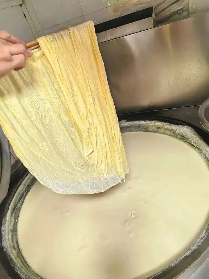 “豆浆在桶内静置十几分钟后,表面会形成一层薄薄的凝结物,这就是豆皮。揭豆皮也很简单,不熟练或者豆皮面积大的时候,拿根细棍子伸到豆皮下面,轻轻往上一挑,一张豆皮就揭下来了。”刘海艳用手比画了一下:“豆皮揭下来后,短时间晾晒一下就行了。”半干的豆皮折叠后不破不碎,表面一层油光,闻起来豆香四溢,但这种豆皮因不易存储,须尽快食用。