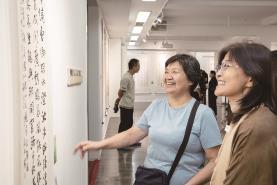 整个展厅布置简洁,灯光照射过来,作品字迹更显清晰。参观者陆陆续续走进展厅,有的独自伫立在作品前,目光专注地扫视着笔墨细节;有的三两个人聚在一处,指着作品各抒己见,交流着对字迹风格和内容的看法,展厅氛围安静而有序。