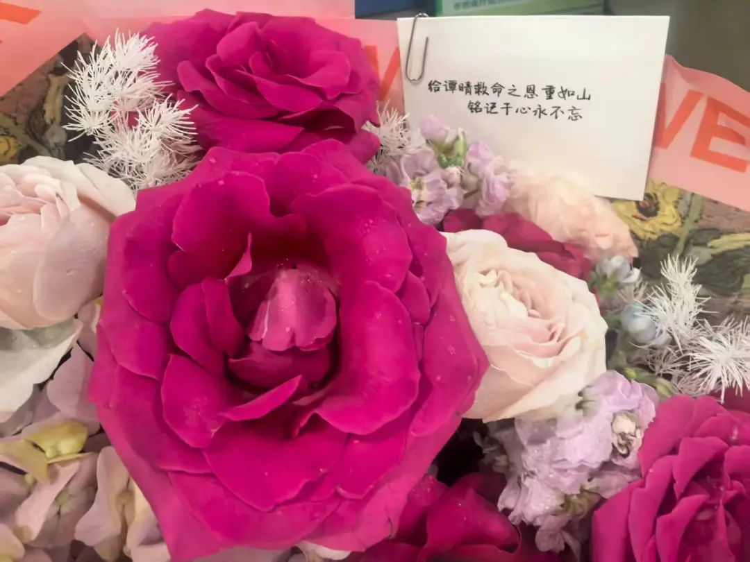 18日下午,女子的家属特意到医院送来锦旗和鲜花,卡片上写着——谭晴救命之恩重如山,铭记于心永不忘。