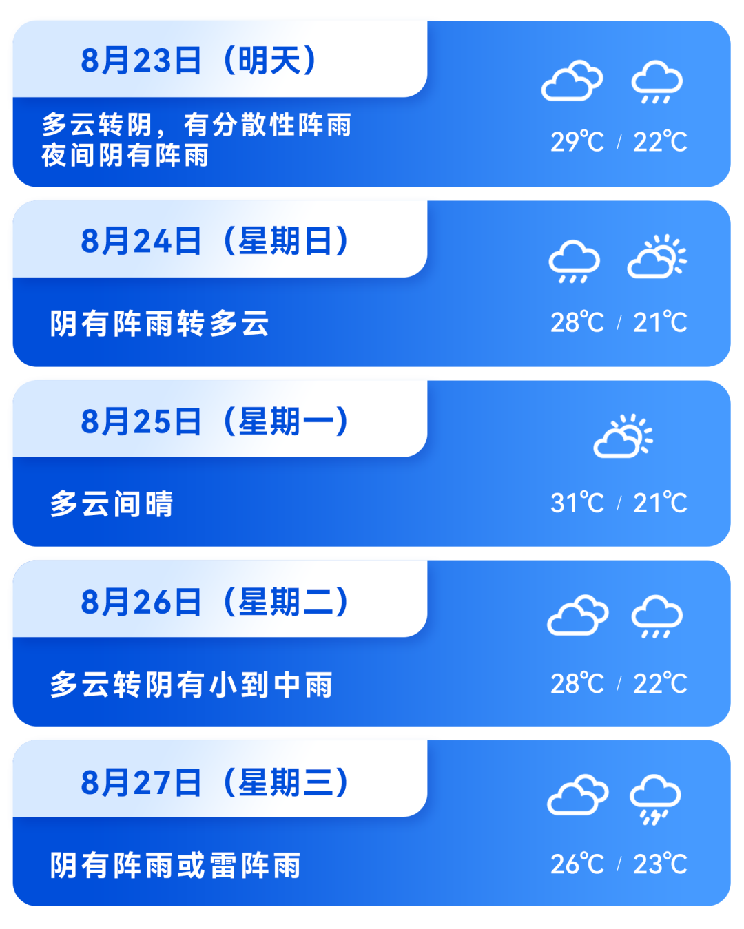 今天夜间多云间阴,有分散性阵雨,南转北风 1、2 级,最低气温 24℃;周六白天多云转阴,有分散性阵雨,夜间阴有阵雨,气温29~22℃;周日白天阴有阵雨转多云,夜间多云,气温28~21℃。