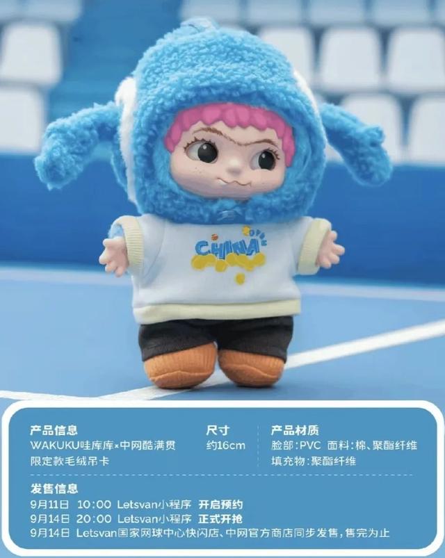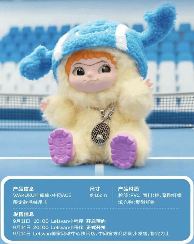 此次合作共推出10款“北京礼物”限定潮玩,包括“WAKUKU哇库库×中网”胖哒哒限定款毛绒公仔800%、“WAKUKU哇库库×中网”酷满贯限定款毛绒吊卡、“WAKUKU哇库库×中网”ACE限定款毛绒吊卡等,所有限定产品将于9月14日全球开售,用户可以在Letsvan奇梦岛线上官方旗舰店或中网线下销售网点、奇梦岛快闪店等渠道购买。