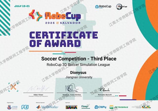 近日,2025年RoboCup机器人世界杯在巴西成功举办。物联网工程学院Dionysus团队荣获2025年RoboCup机器人世界杯3D Soccer Simulation(仿真三维组)季军,追平了中国高校队伍在该组别近十年来的最佳成绩。