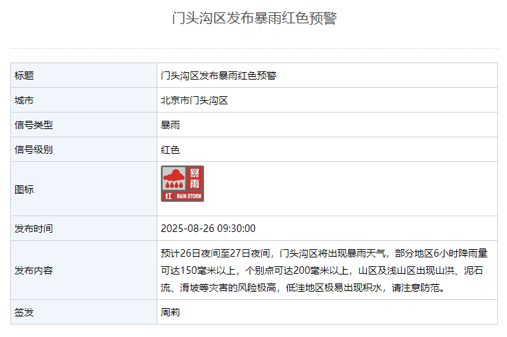 8月26日9时30分,门头沟区发布暴雨红色预警:预计26日夜间至27日夜间,门头沟区将出现暴雨天气,部分地区6小时降雨量可达150毫米以上,个别点可达200毫米以上,山区及浅山区出现山洪、泥石流、滑坡等灾害的风险极高,低洼地区极易出现积水,请注意防范。