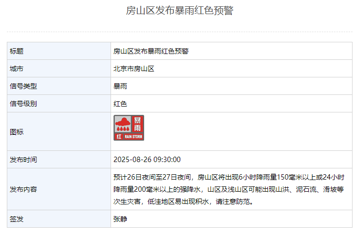 8月26日9时30分,房山区发布暴雨红色预警:预计26日夜间至27日夜间,房山区将出现6小时降雨量150毫米以上或24小时降雨量200毫米以上的强降水,山区及浅山区可能出现山洪、泥石流、滑坡等次生灾害,低洼地区易出现积水,请注意防范。