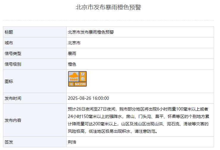 8月26日16:00,北京市发布暴雨橙色预警。预计26日夜间至27日夜间,我市部分地区将出现6小时雨量100毫米以上或者24小时150毫米以上的强降水,房山、门头沟、昌平、怀柔等区的个别地方累计降雨量可达200毫米以上,山区及浅山区出现山洪、泥石流、滑坡等灾害的风险极高,低洼地区极易出现积水,请注意防范。