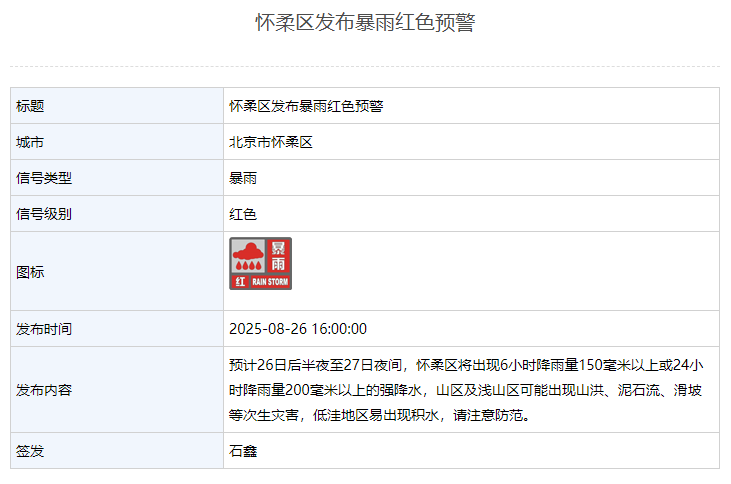 8月26日16时,怀柔区发布暴雨红色预警:预计26日后半夜至27日夜间,怀柔区将出现6小时降雨量150毫米以上或24小时降雨量200毫米以上的强降水,山区 及浅山区可能 出现山洪、泥石流、滑坡等次生灾害,低洼地区易出现积水,请注意防范。