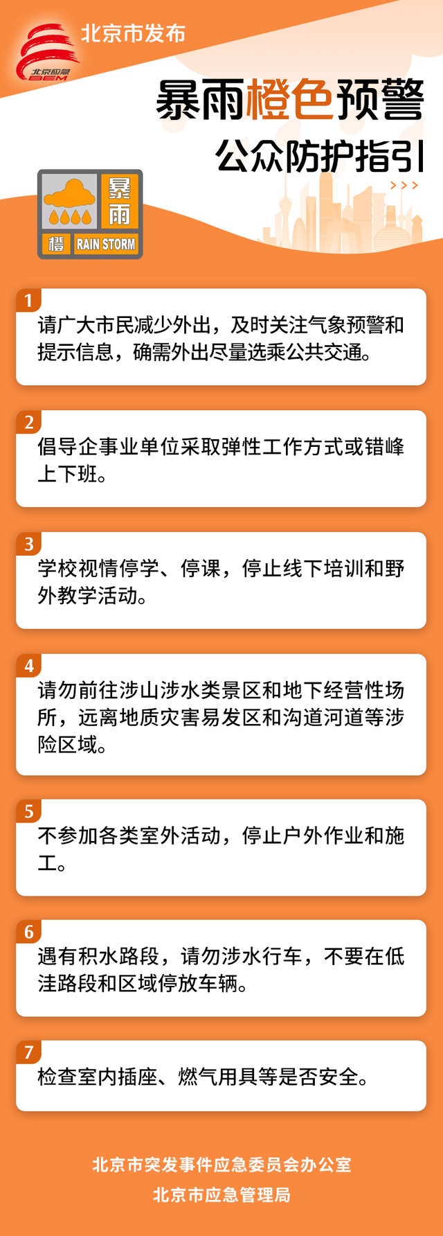 关注预警,安全相伴。市应急办发布暴雨橙色预警公众防护指引,请广大市民朋友注意安全防范。