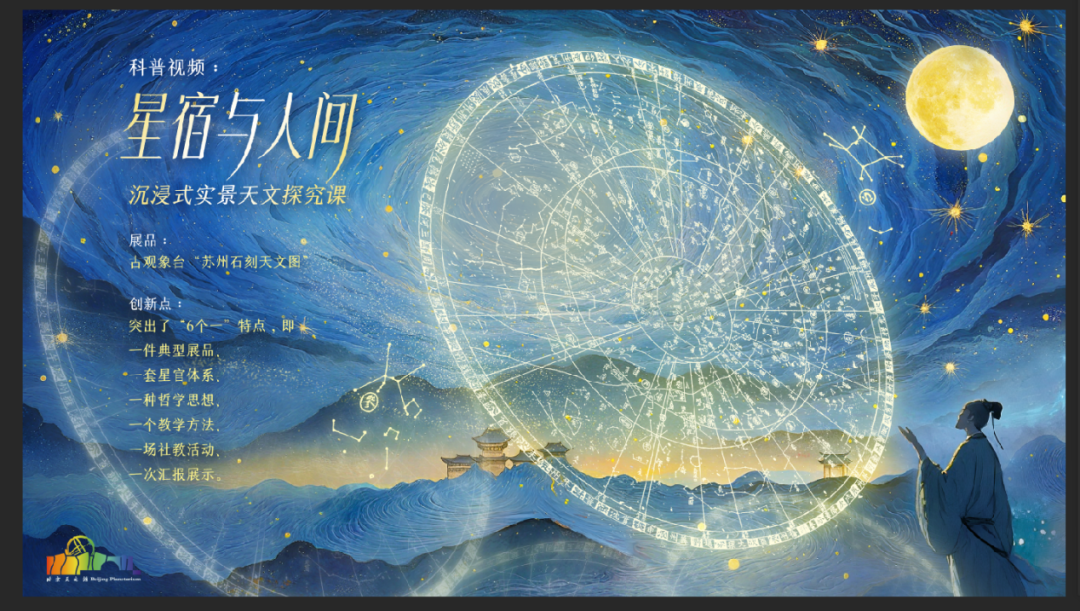 北京天文馆新媒体科普短视频《星宿与人间》申报参加。天文馆融媒体团队将馆内线下的活动课程内容进行可视化创作处理,以北京古观象台展品“苏州石刻天文图”为主,向观众详细介绍世界上现存最古老的根据实测绘制的全天石刻星图;展示了中国古代以“三垣二十八宿”为代表的一整套中国传统星官体系对传统农耕生产生活的广泛影响;以及其中蕴含的“天人合一”的一种中国传统哲学思想,是中国优秀传统文化与中国古代天文学相融合的重要体现。在科学内容的探究过程中,科技辅导员采用PBL教学法,通过一场带领青少年在实地模拟实验的社教活动,掌握天文现象背后的科学知识,辅以古语古文进行验证,融入情感教育和价值观引导,形成探究闭环,让观众在了解科学知识的同时,激发受众的民族自豪感,增强文化自信与历史使命感。