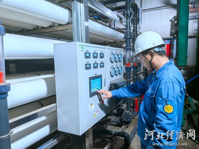 在金泰包装材料公司软水处理车间,工作人员操控反渗透膜装置,将浓水(脱盐水)过滤为纯净水。河北经济日报记者 吴新光 摄