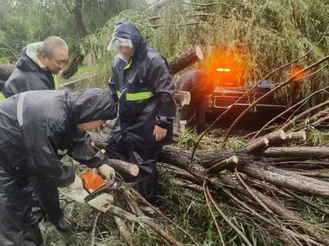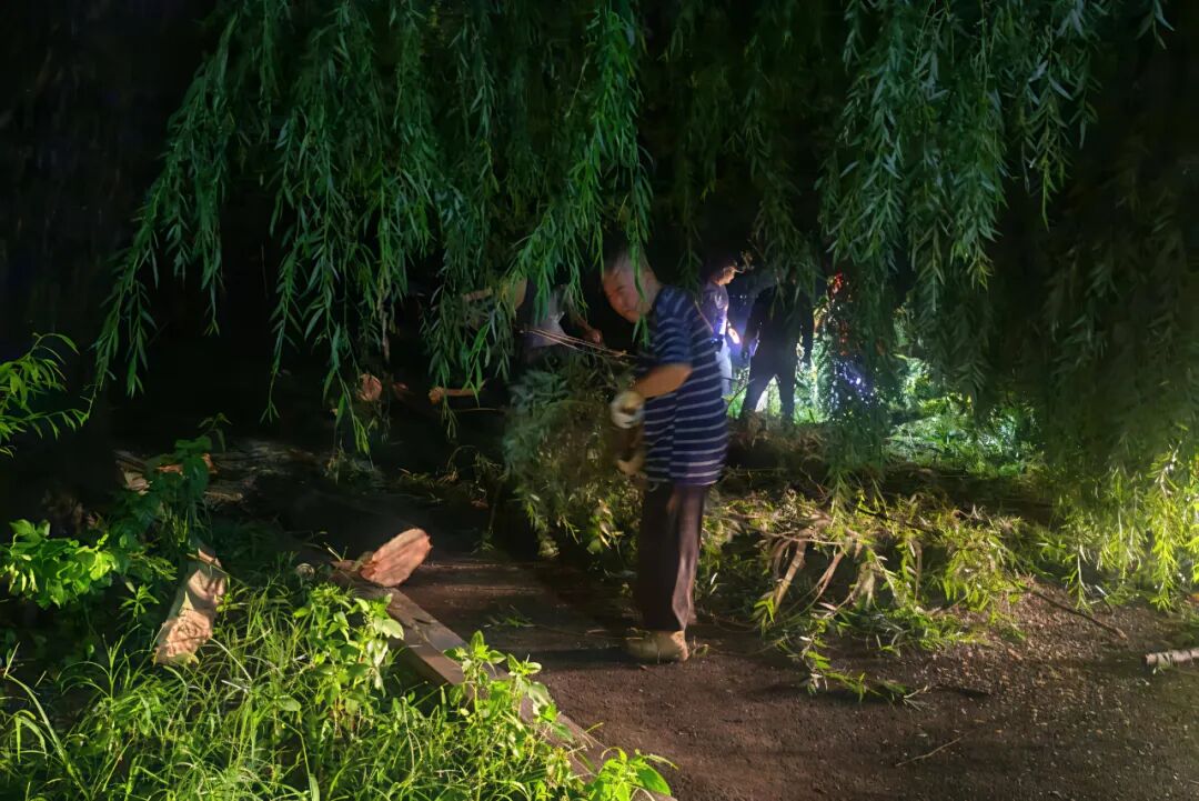 8月19日,因强降雨,北石槽镇北木路西侧路段树木折断,砸中一台过路车辆,堵塞道路影响车辆通行。北石槽集体林场党支部及时调集4个车队16名应急队员,分工合作开展安全警戒、人员解救、移除树木、引导绕行等工作,经过20分钟紧急处置,成功解救2名被困人员,清理现场并恢复通车。同一时间,集体林场应急队还及时处置了另外3处树木折断阻路、2处积水过深问题。