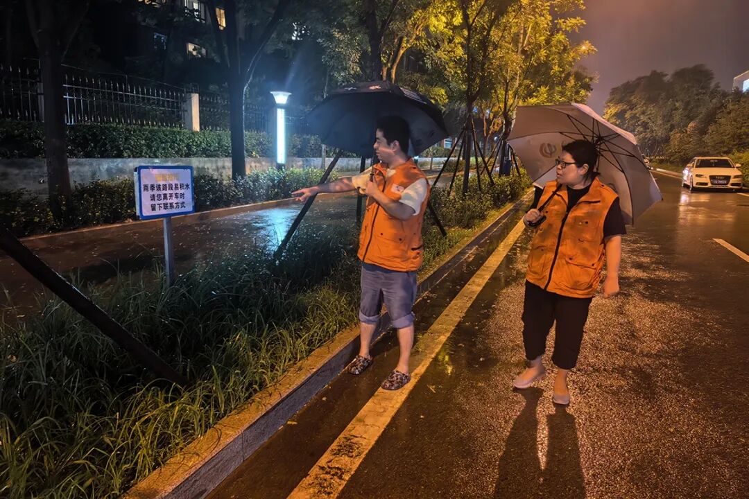 香悦第二社区党员雨中巡查社区南侧顺恒大街积水情况。
