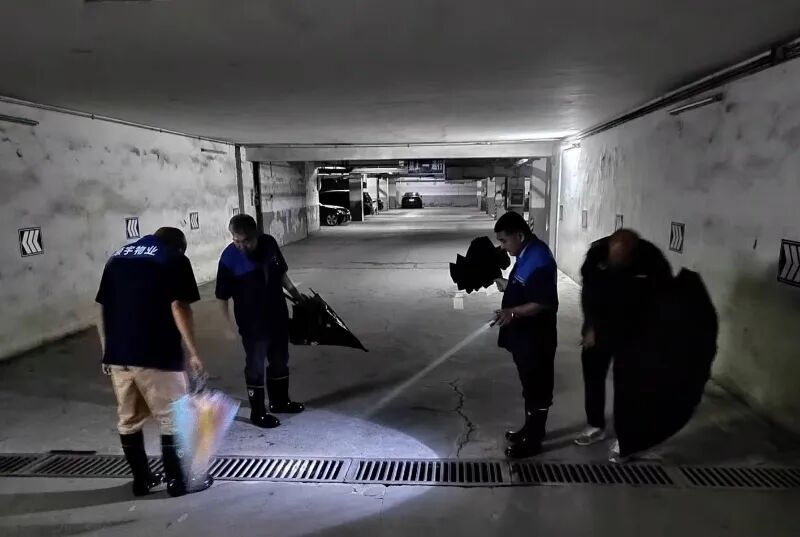 科创集团所属企业党员在车库巡查排查雨水箅子排水情况。