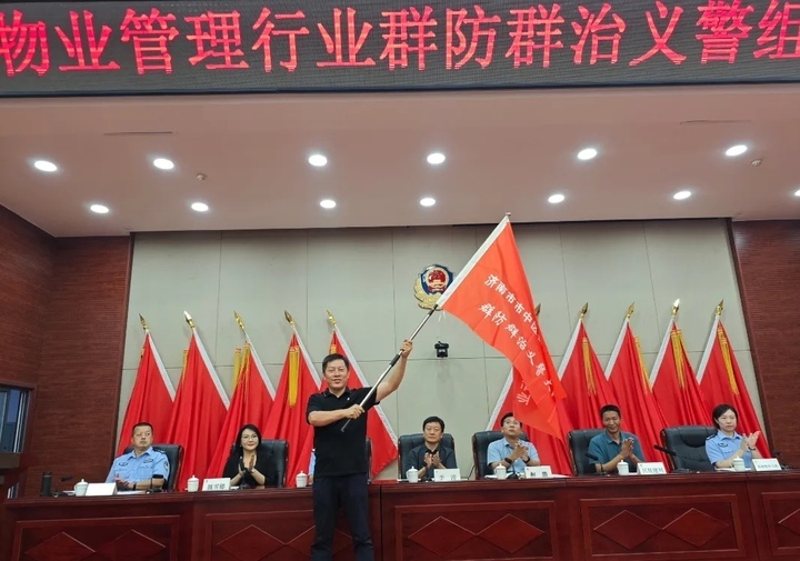在授旗环节,齐鑫物业负责人代表行业接过群防群治义警大队旗帜,与会领导共同为首批11支义警队授牌。德尚行物业负责人代表群防群治义警队承诺,将结合便民活动开展防诈宣传,对孤寡老人等特殊群体“一对一”帮扶,扩大巡防范围,维护社区治安,让业主感受到“义警就在身边”。