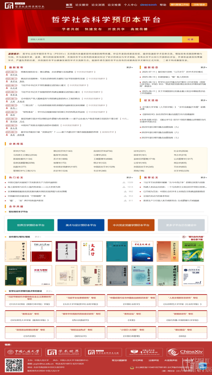 据介绍,“学术世界”一期推出了国内首个哲学社会科学主文献平台(https://zszwx.cn)、首个哲学社会科学预印本平台(https://zsyyb.cn)。“哲社主文献”是一个高效研读学术精品的指南,通过精选和精加工5‰的最优质论文,支持深度学习和智能挖掘,有效缓解了信息爆炸和信息污染造成的“知识饥饿”和“阅读焦虑”问题。“哲社预印本”是一个快速发布研究成果的园地,为学者提供成果审核、预印发布、开放评阅、荐稿选稿、在线发表、复印转载、全媒体传播、成果转化等全过程服务,有效破解了期刊出版周期长、青年学者发表难的问题。