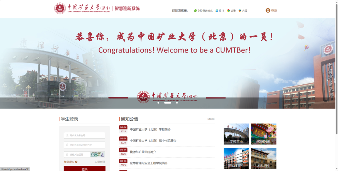登录系统:网址http://zhyx.cumtb.edu.cn,账号为考生号,密码为身份证号后六位。