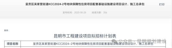 8月28日,昆明市公共资源交易信息网发布“呈贡区吴家营街道KCC2024-2号地块保障性住房项目配套基础设施建设项目设计、施工总承包”招标计划。