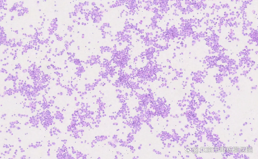 患者男性,76岁,因受凉后出现咳嗽、咳痰,伴咽痛、咳白痰就诊于清华大学附属垂杨柳医院呼吸与危重症医学科门诊,后入院治疗。在对症治疗后患者自觉憋气,夜间不能平卧,无明显少尿、下肢水肿。胸部CT示:右侧胸腔积液伴右肺下叶膨胀不全。临床抽取适量胸水送至病理科做细胞涂片检查。