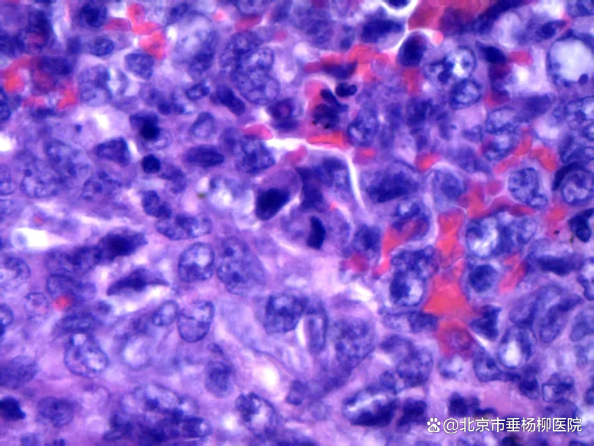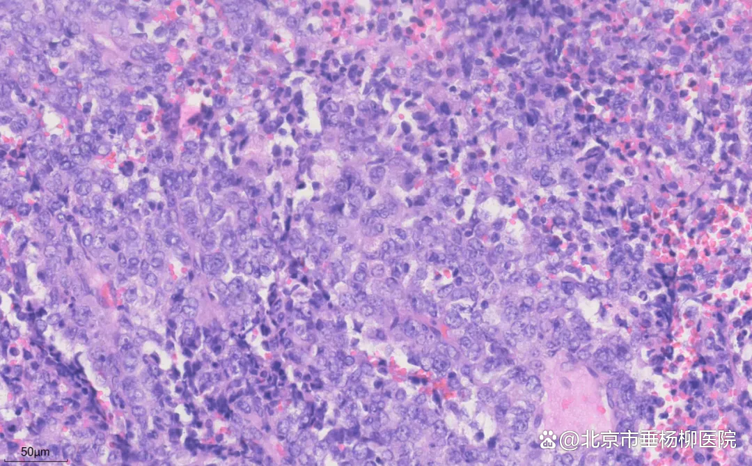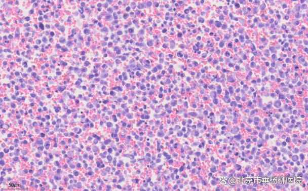 胸水传统细胞学涂片:镜下细胞量丰富,弥漫分布,细胞核大异型,部分胞浆丰富,染色质较细腻,核分裂象易见。