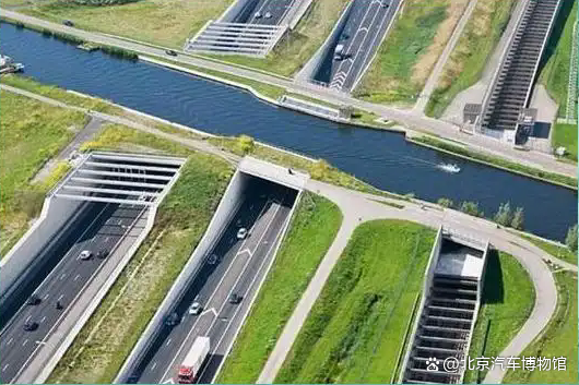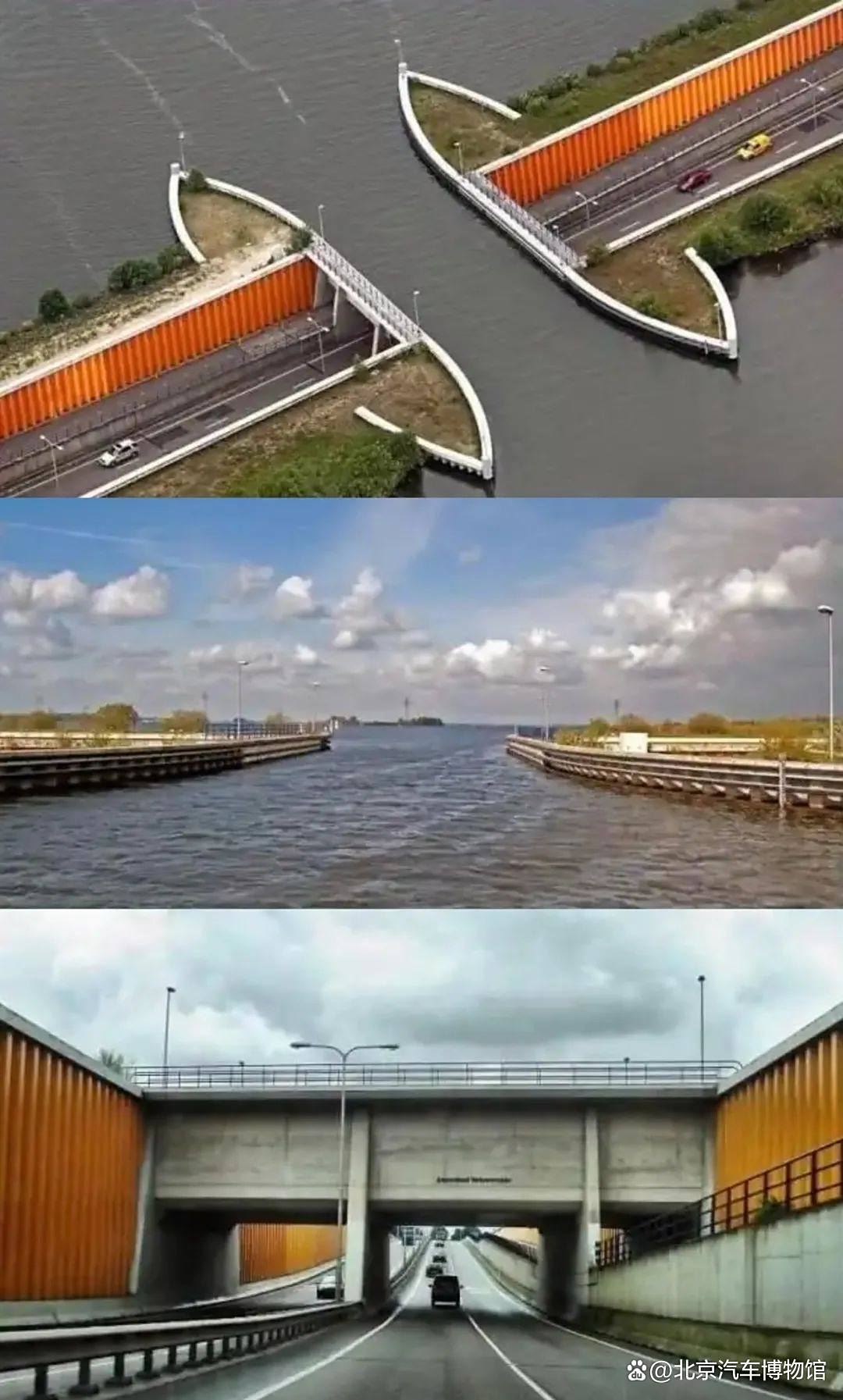 通常,我们对于“桥”的理解是它横跨在河流之上,而河水则在桥下流淌。然而,荷兰人却打破了这个传统认知。他们依托荷兰海拔低的特点,巧妙地将桥与河的位置互换,把公路建造在河面之下,同时将河流引入路面之上。这样的设计不仅颠覆了我们的认知,更展现了一种独特的创新与美感。