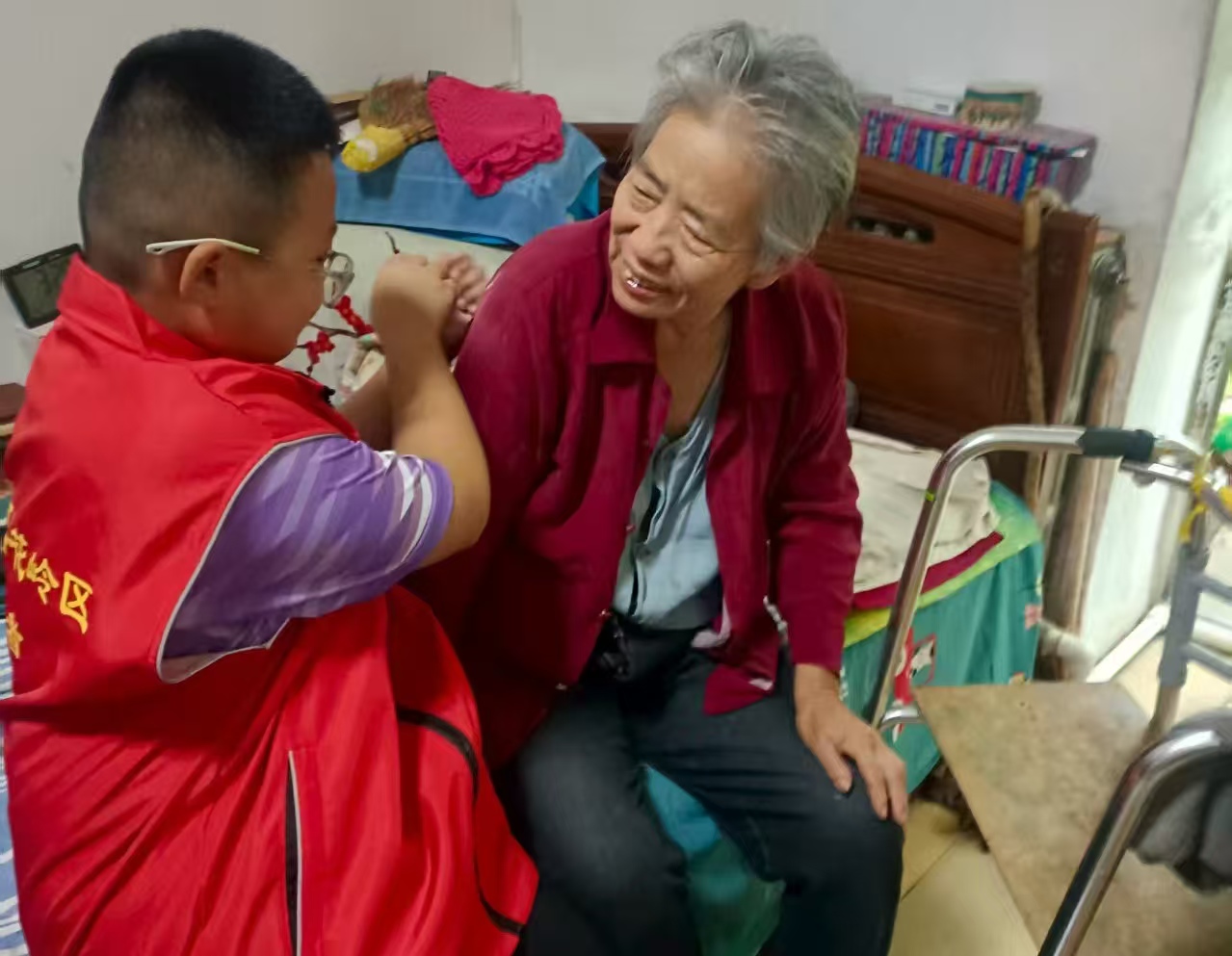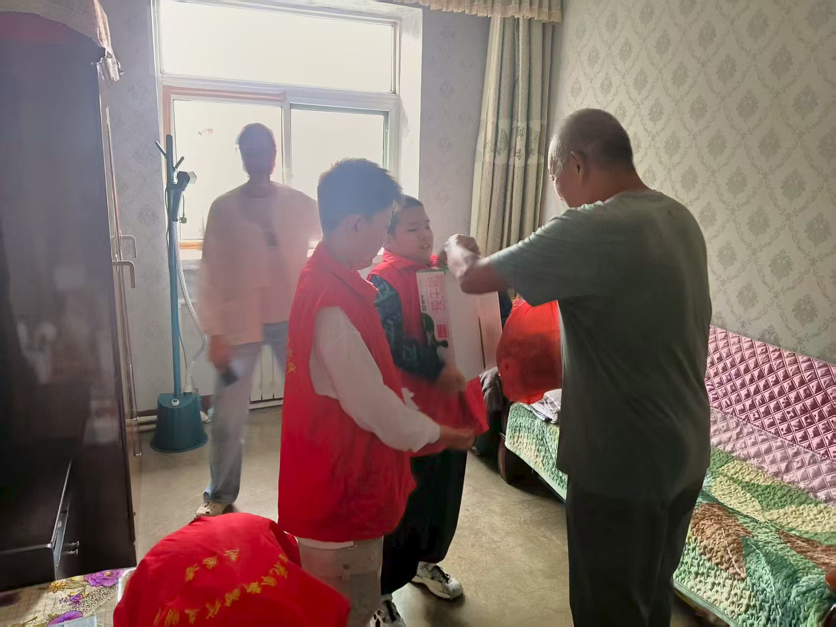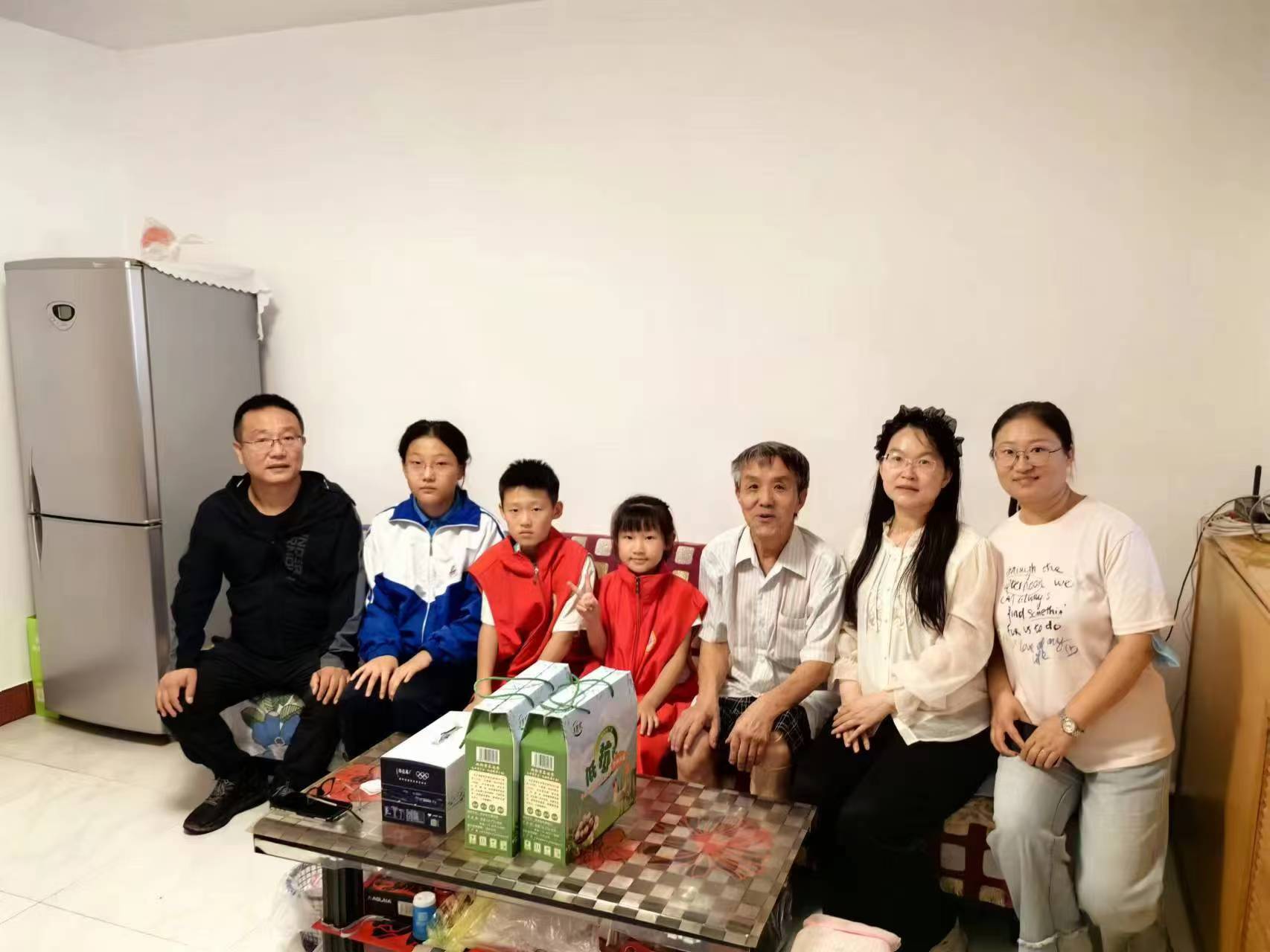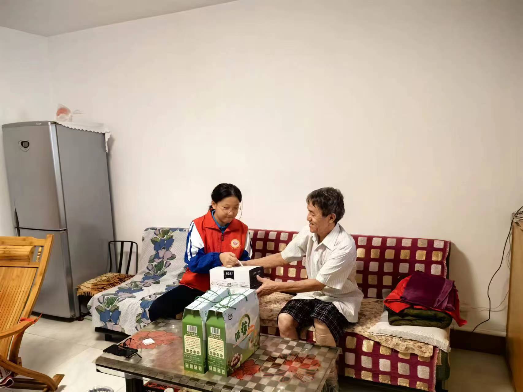 活动当天,连日的阴雨并未停歇,上午的小雨淅淅沥沥,却丝毫未阻挡大家的热情。家长与孩子们早早行动,根据残疾老人的实际需求,精心采购了各类生活物资;下午,所有人风雨无阻,按时抵达社区集合,用实际行动践行“奉献、友爱、互助、进步”的志愿精神,既让残疾老人感受到社会大家庭的温暖,也引导学生学会尊重生命、关爱他人。“每个老人家里空间有限,为了不打扰老人生活,我们先分成三个小组,每组由一名社区工作人员带队入户慰问。”社区负责人在集合时细心安排。随后,各小组有序开展入户走访。志愿者们为贫困残疾人家庭送上了牛奶、水果、糕点等慰问品,与老人们促膝长谈。他们详细询问老人们的日常生活与身体状况,耐心倾听老人的心声,轻声叮嘱老人注意保重身体,鼓励他们以乐观的心态面对生活中的挑战与困难。老人们也十分欣慰,不仅给孩子们讲述过往的故事,还热情地拿出家中的老物件,与大家分享岁月的记忆。