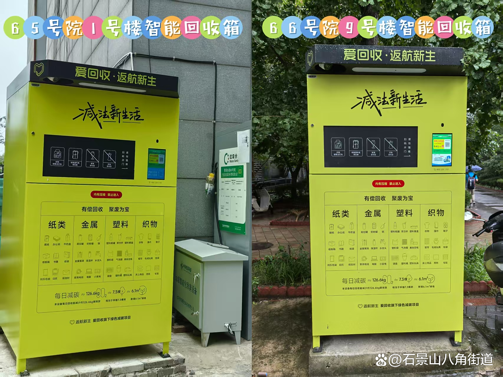 为切实提升社区环保水平,优化垃圾分类处理模式,提高居民的环保意识与资源回收利用的参与度,景阳东街第二社区分别于65号院 1号楼旁和66号院9号楼旁各设置了一处“爱回收”智能回收箱,为社区环保工作带来了新的力量。