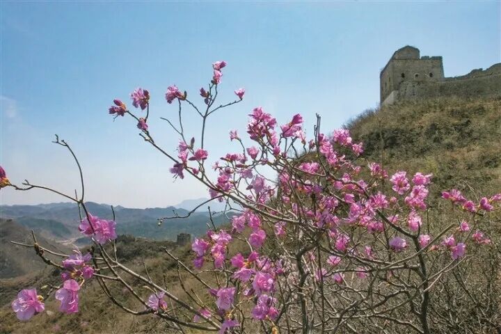 盛开的杜鹃花为春季的董家口长城增添一抹亮色。