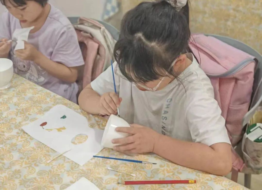 在广外街道蓝天逸景托育中心,京彩瓷手工课让传统文化焕发新彩。一对小姐妹在老师的指导下正细心地绘画瓷杯,她们先是挑选出自己喜欢的颜色挤在纸张上,然后轻轻地勾勒线条,一点点描绘出心中的画面。课程不仅提升了孩子们的绘画技能,更在潜移默化中加深了对传统文化的理解与热爱。该中心配备的专业营养师,根据节气调整每日食谱,伏天推出“冬瓜薏米汤”预防暑热,立秋后增加“山药小米粥”健脾养胃,细致关怀让近百名职工子女吃得健康、学得开心。