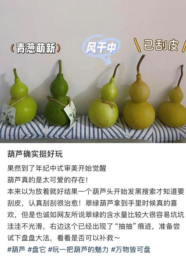 “十几元的青皮葫芦,完美适配了当代年轻人‘拒绝过度消费、追求性价比’的消费逻辑。”业内人士表示,相比文玩圈动辄几百上千的核桃、橄榄、手串,十几元的葫芦几乎没有什么试错成本,哪怕第一次打皮失败、阴干时开裂,也不会心疼。如果养护得当,一个葫芦可以盘玩几年甚至十几年,随着包浆越来越厚,葫芦的“质感”还会不断提升——相当于“十几元买了一个能长期陪伴的爱好”。
