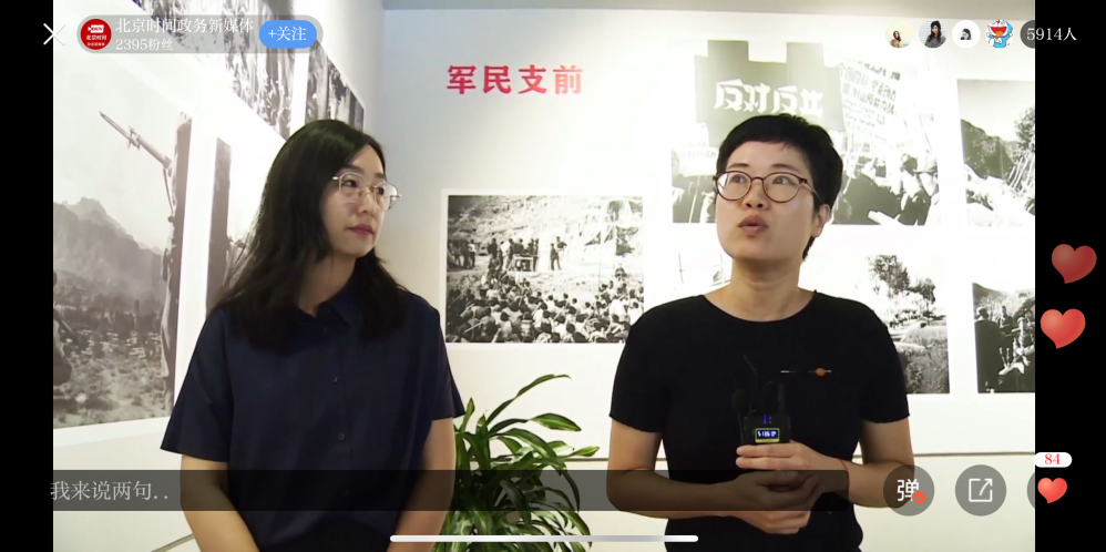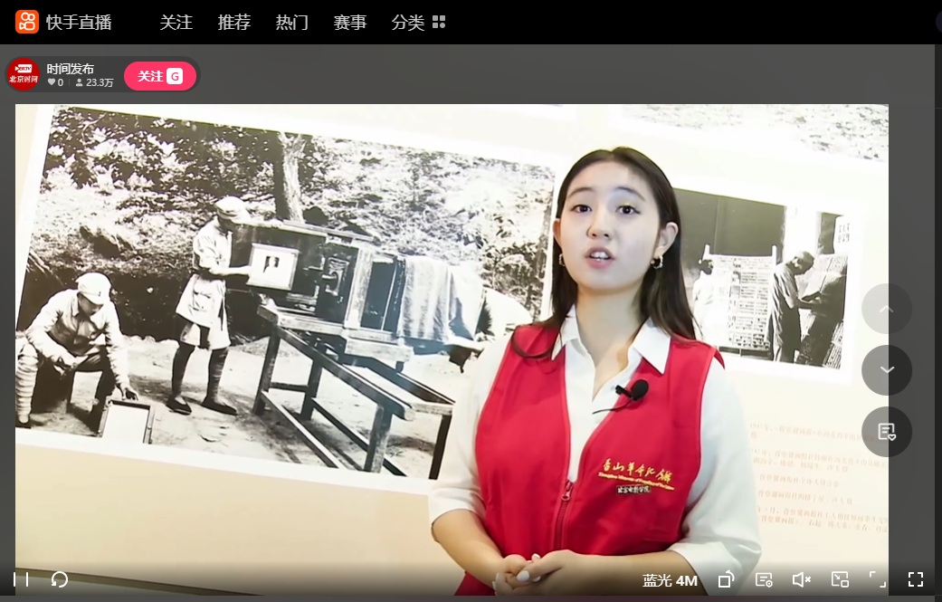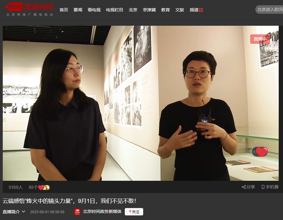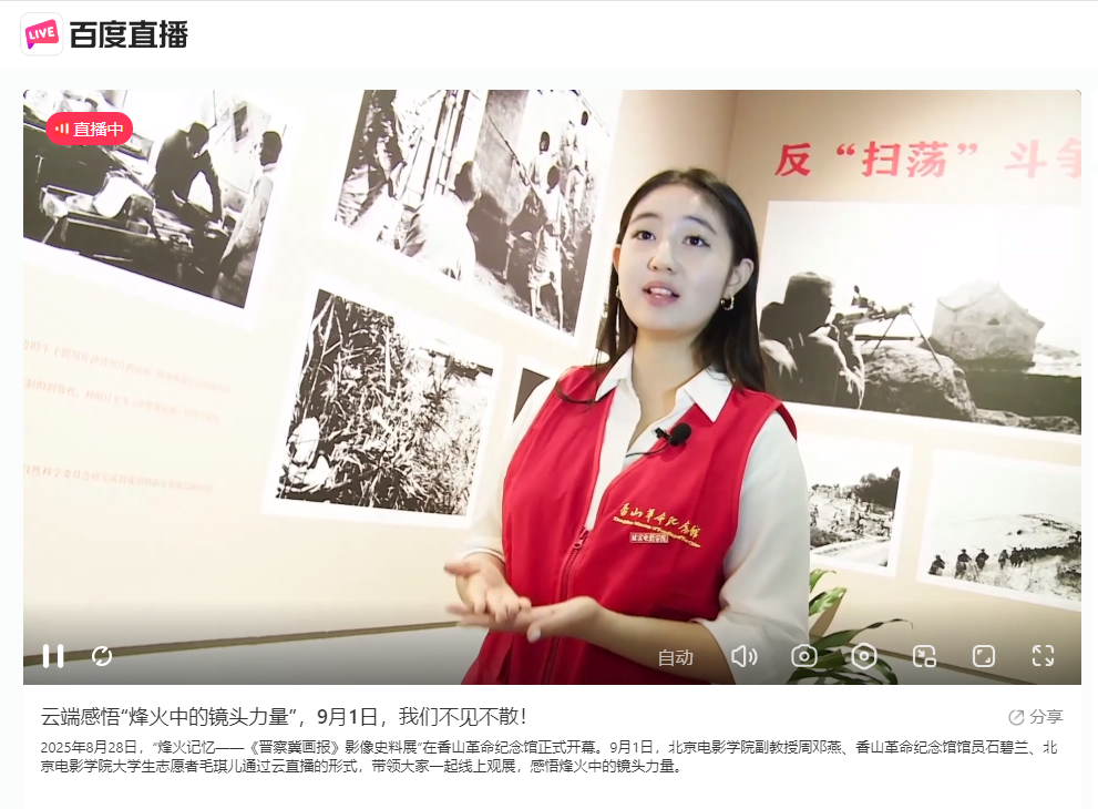 直播中,北京电影学院大学生志愿者毛琪儿首先从年轻人视角出发,以生动活泼的语言赋予历史以青春气息,拉近了年轻观众与历史的距离,为观众带来了不一样的观展体验;随后,香山革命纪念馆馆员石碧兰以提问的方式引导讲解,引出对展览历史脉络与重要事件的深入探讨,北京电影学院摄影系副教授周邓燕则从专业视角,对历史照片的拍摄背景、创作意图与时代价值进行了细致解读和回应,使观众对展览有了更全面、更深入的理解。