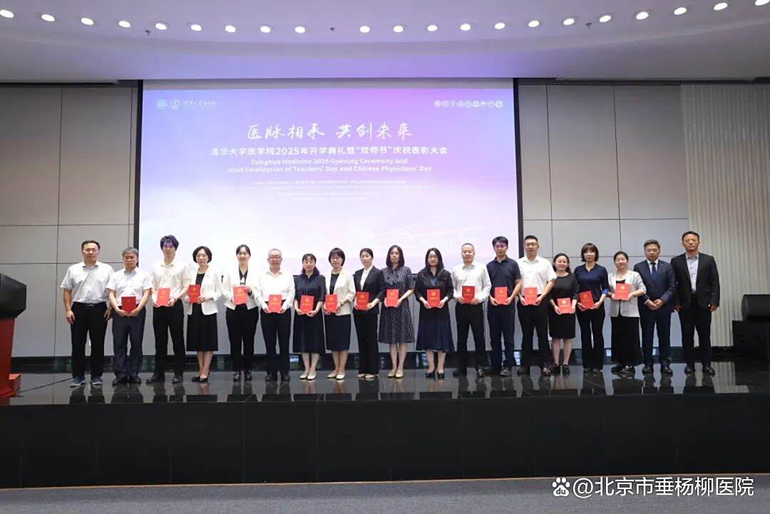 会上,对2025年度清华大学医学院“紫荆奖-优秀医师”称号获得者进行了表彰。清华大学附属垂杨柳医院医生钟洁、黄敏、王立春、张莉、郭函、吴文杰、钟鹏、毛磊、杨磊磊、谢俏10位医生获得了该奖项。清华大学医学院领导以及清华大学附属垂杨柳医院党委书记吴兴海为10位优秀医师颁奖并合影留念。