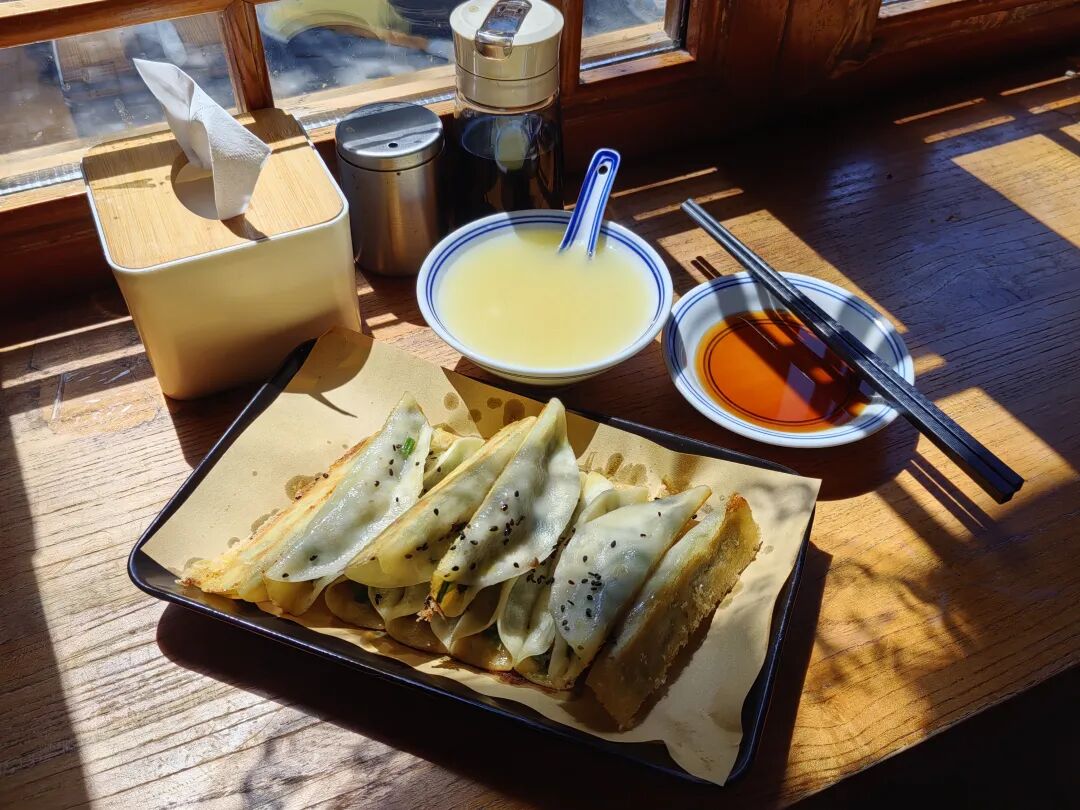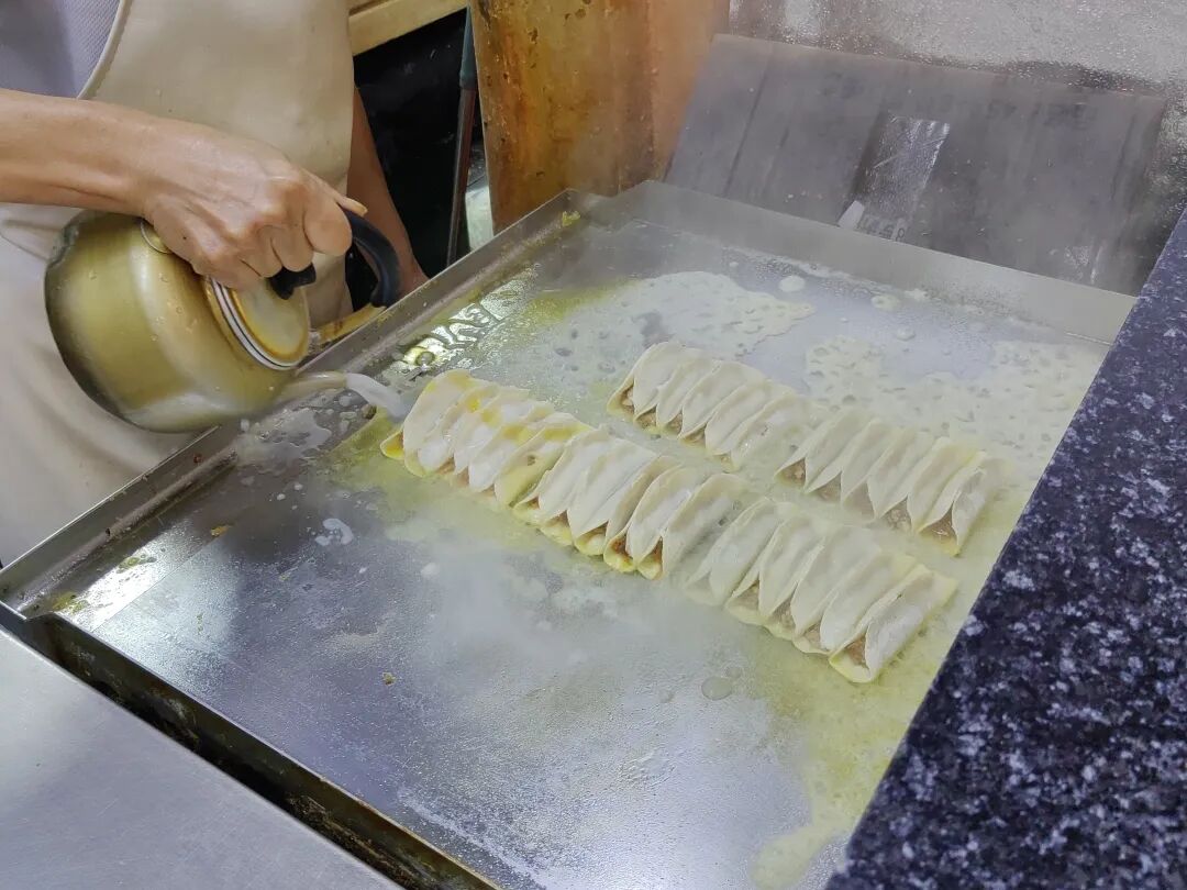 店里的锅贴都是现包现煎的,馅料有猪肉三鲜、猪肉韭菜、猪肉老倭瓜、韭菜鸡蛋和羊肉西葫芦五种,师傅把锅贴码在平底锅里,倒上油和水,煎到外皮金黄酥脆。趁热咬开一口,汁水特别足,肉的鲜混着菜的香,让人不知不觉中还想再来一份。