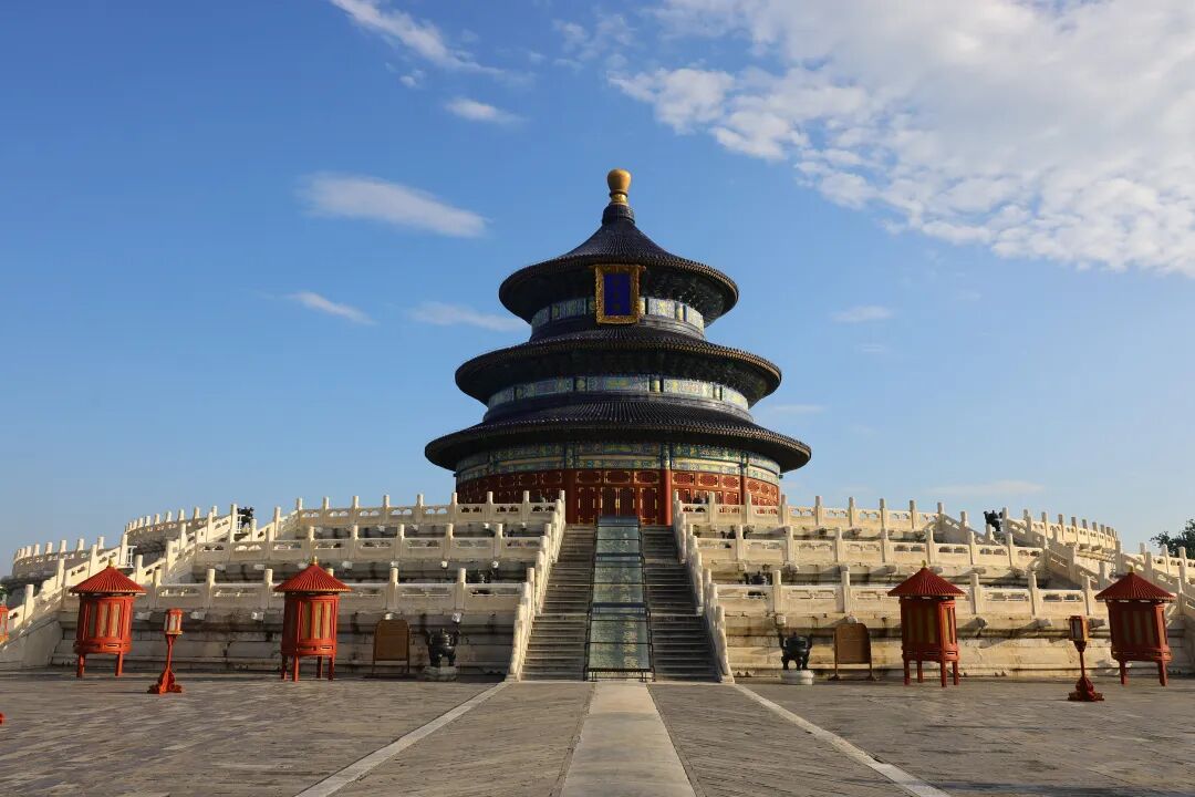 自毗邻地铁站的天坛公园东门进入园内,一路向西,就能看到天坛的核心建筑祈年殿。走到祈年殿脚下,会被它的壮观震撼,三层的圆形建筑,蓝色的琉璃瓦在阳光下闪闪发光,屋顶的结构精巧,没有一根钉子全靠木榫连接。来到祈年殿,不光要参观精妙的建筑,喜欢拍照的游客还可以自己跟着教程找到最佳拍摄机位,留下打卡照。