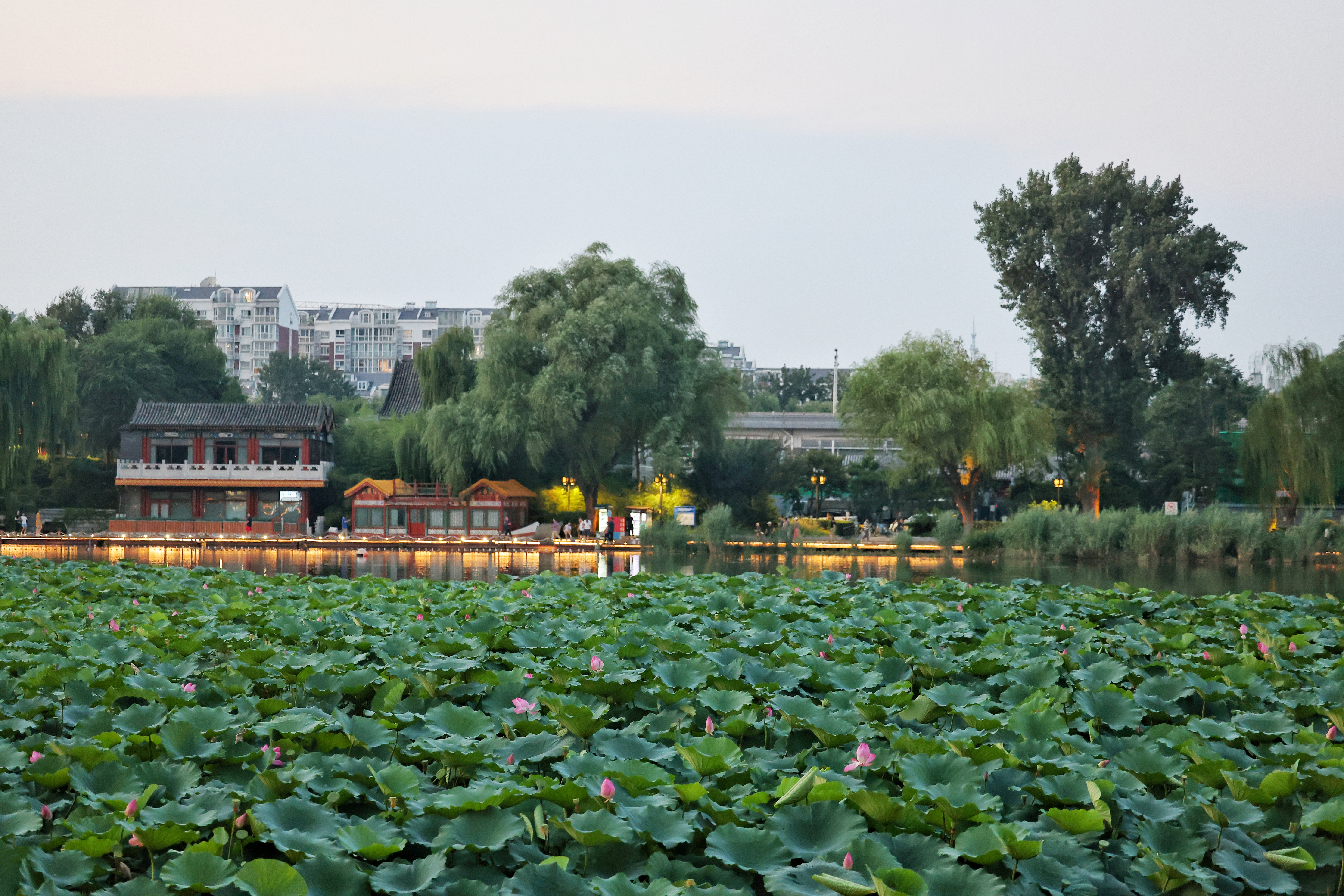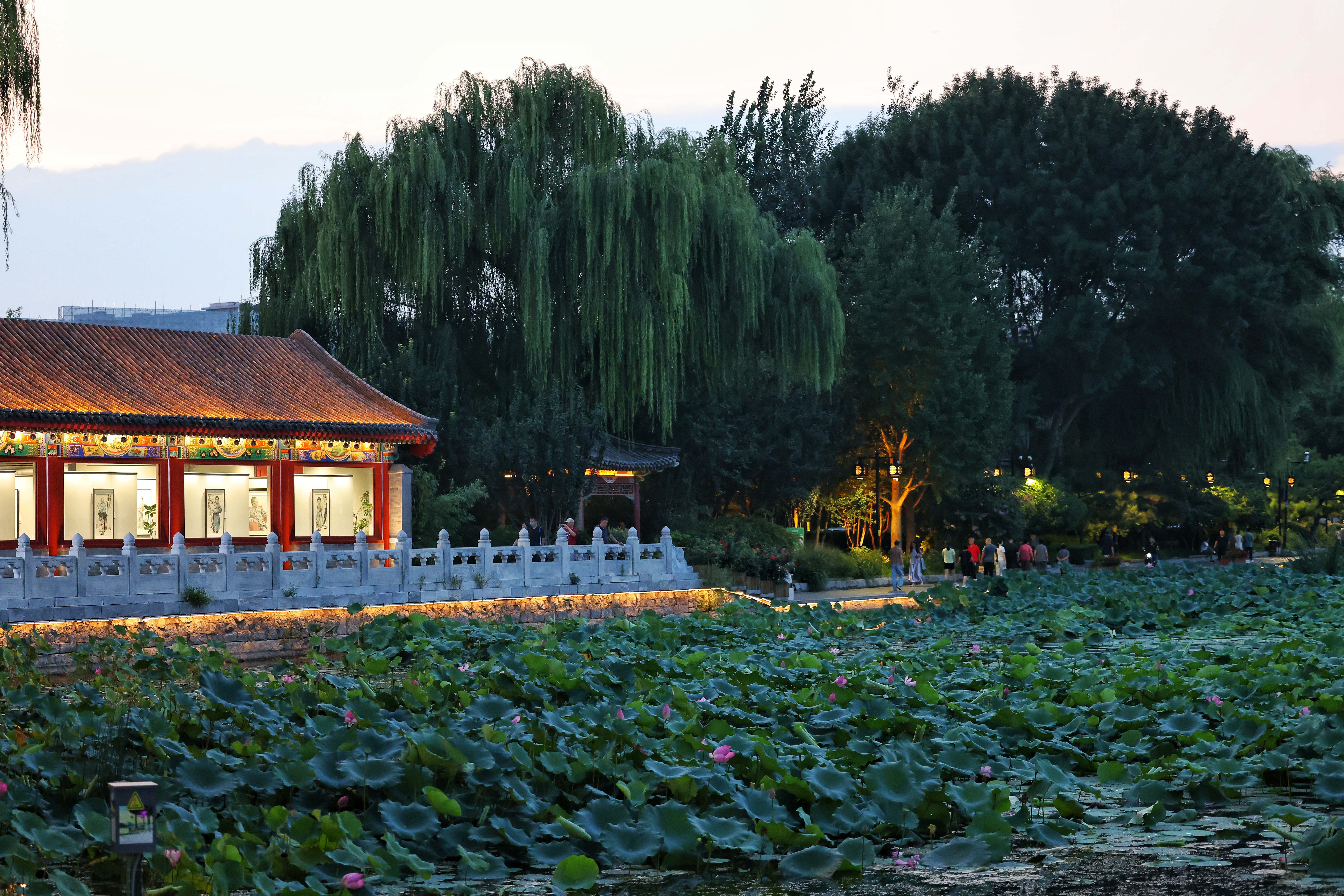 夕阳的余晖为公园镀上了一层温暖的光晕,中式传统建筑在灯光的映衬下,更显古雅韵味。红色的廊柱、精致的窗棂,与周围郁郁葱葱的树木相互映衬,仿佛诉说着老北京的历史与风情。