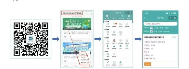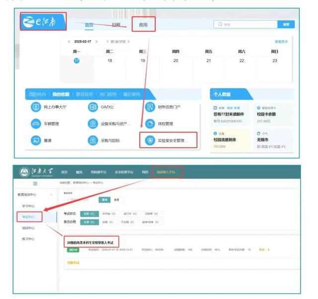 (1)方式①:电脑端:登录“e江南”→“应用”→“实验室安全管理系统”→初次登录(登录账号:学号,默认密码:JNsys@2025#)后需修改默认密码→修改密码后重新登录→“培训准入平台” →“教育培训中心”→“考试中心”进入系统参加考试。