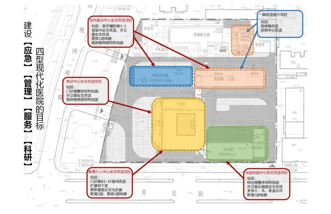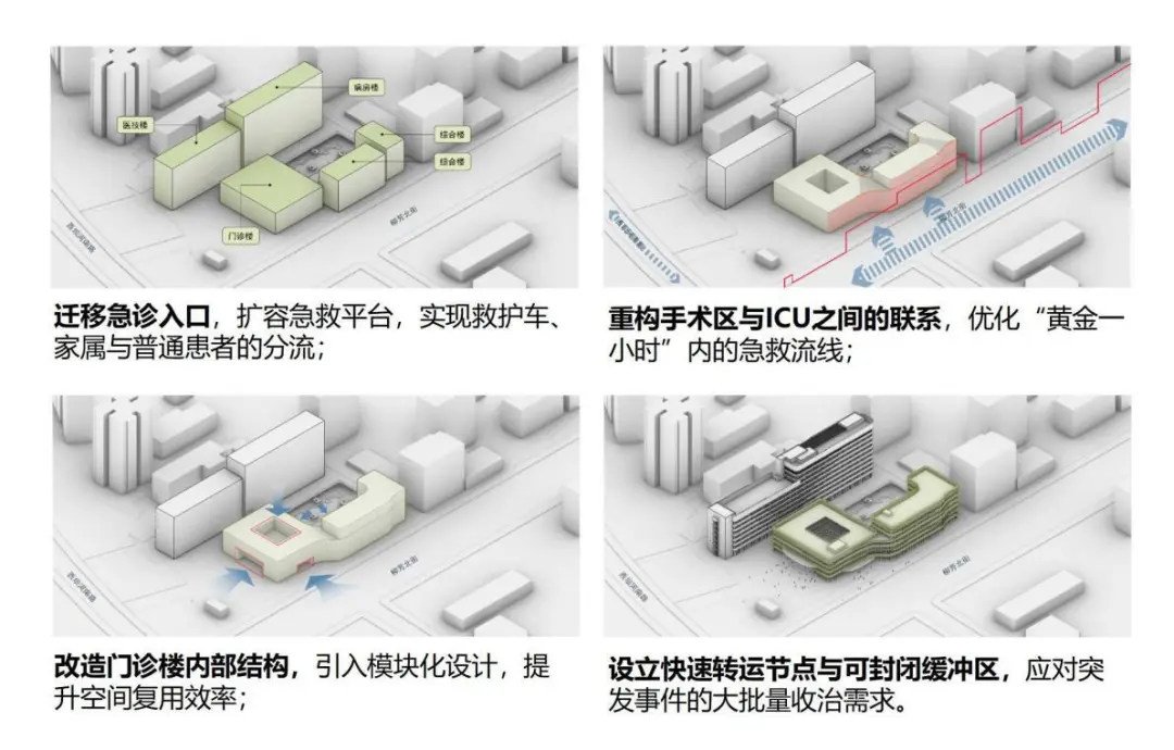 面对这一挑战,中机十院国际工程有限公司没有采用“哪里坏了修哪里”的传统思路,而是创新性地采用了系统思维的整体解决方案。不拼面积,拼效率!每一处设计都围绕 “为生命争分夺秒” 展开,从入口到病区,从日常诊疗到应急响应,全流程优化空间利用,硬是在有限条件下,把老医院改造成了能快速响应的“应急救治堡垒”。